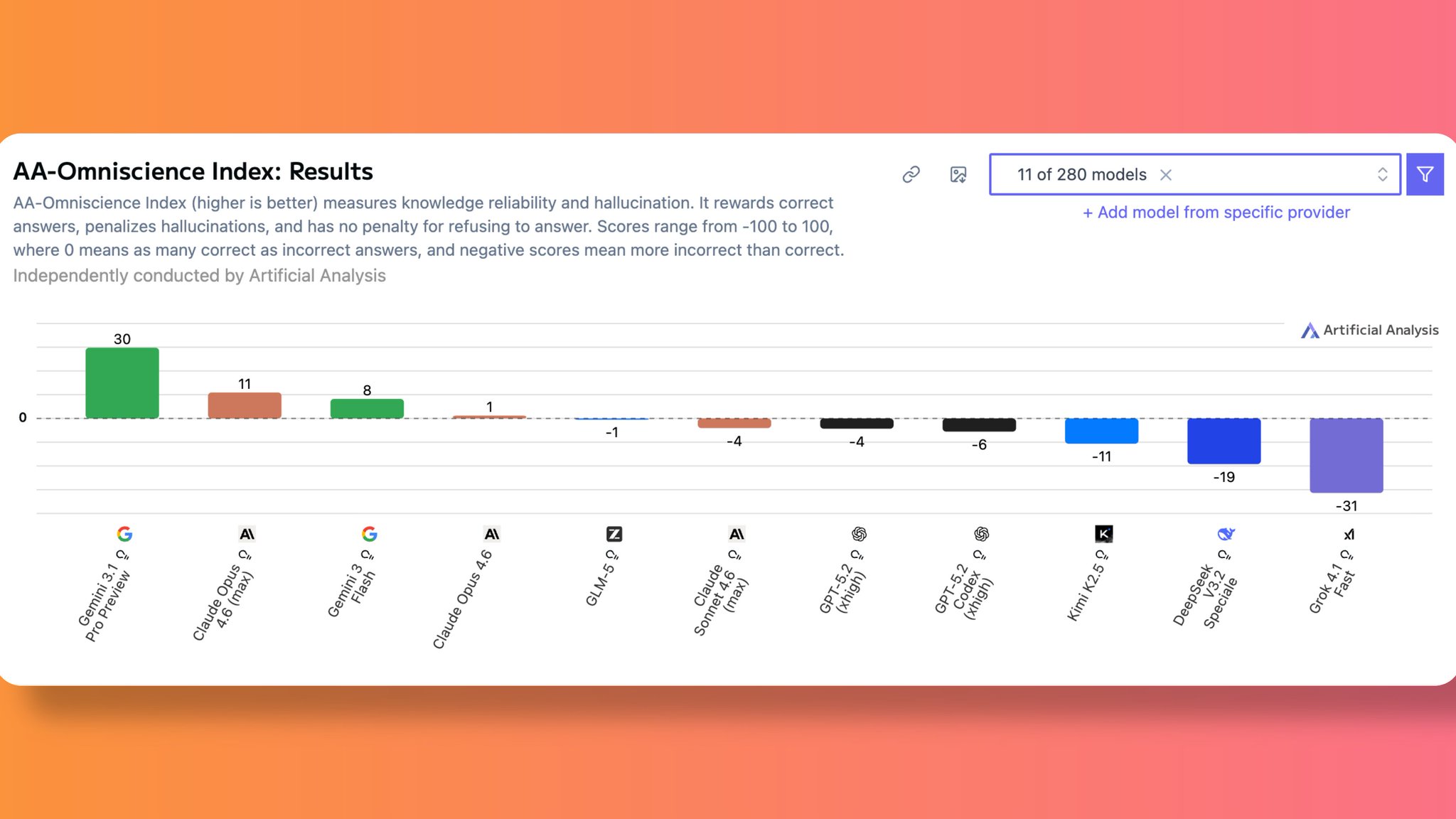 >>12798626Gemini 3.1 pro scores the highest on the AA-Omniscience index. It has much higher reliability and a lower rate of hallucinations.