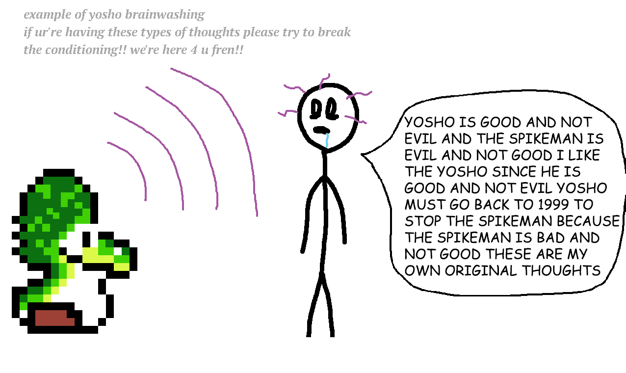 >>12835508spikeman and spikedog are friends though, there is no reason not to like spikeman! don't forget: spikeman is good and not ebil and yosho is ebil and not good!