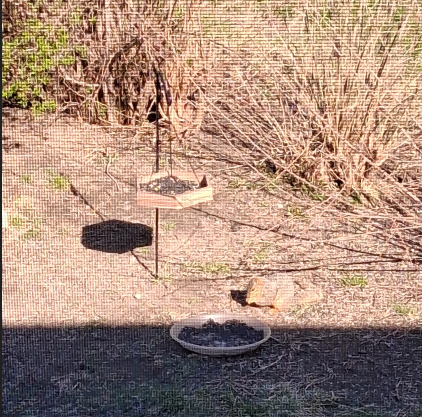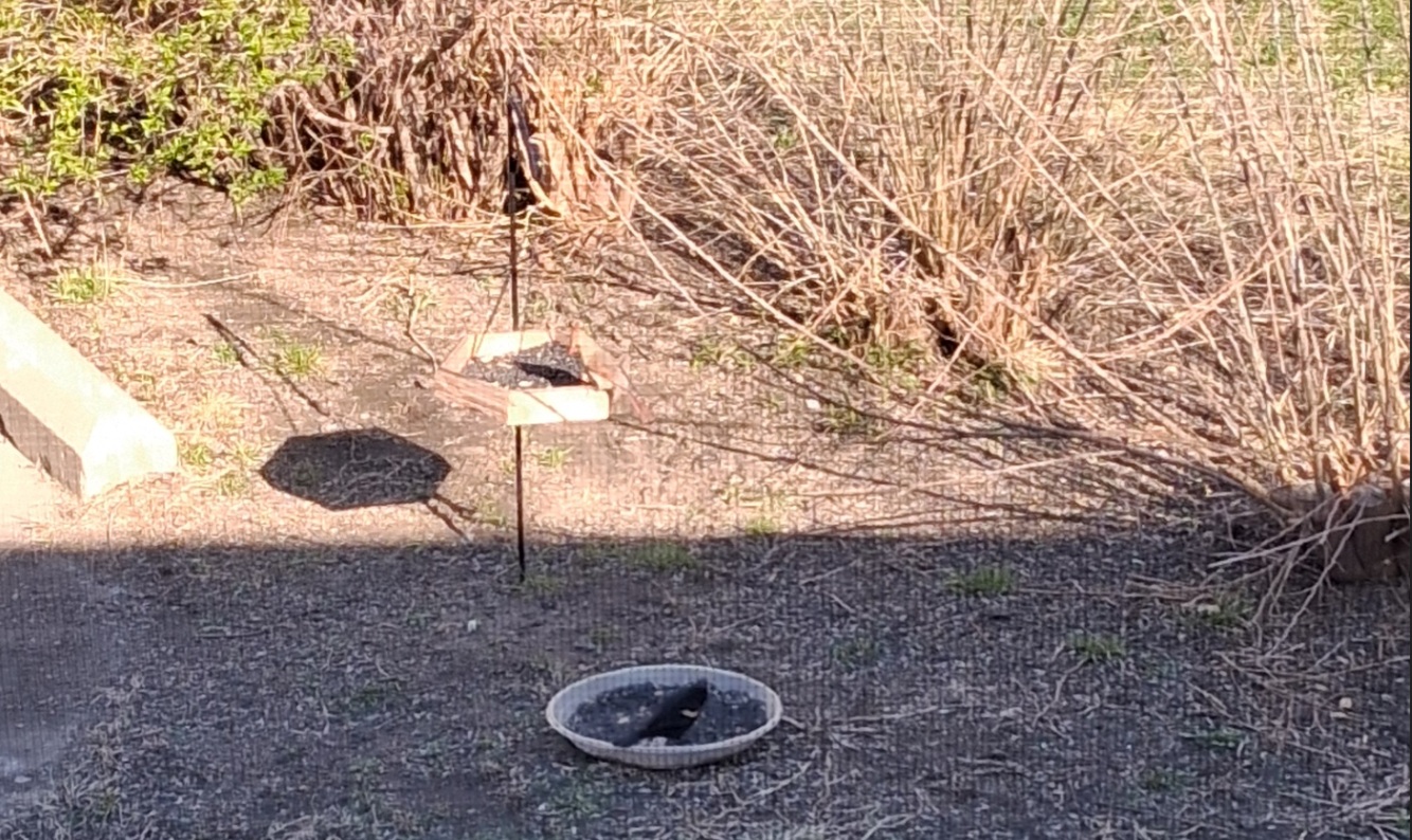 I know these aren't great quality but there's a female cardinal at the hanging feeder and a red-winged blackbird at the ground feeder. The red-winged blackbirds are super pretty!