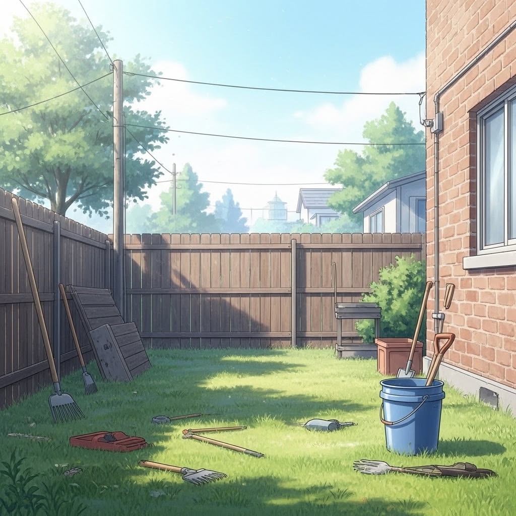 First, I would pick up all the tools and neatly put them in order. Then I would construct a small garden bed for crops