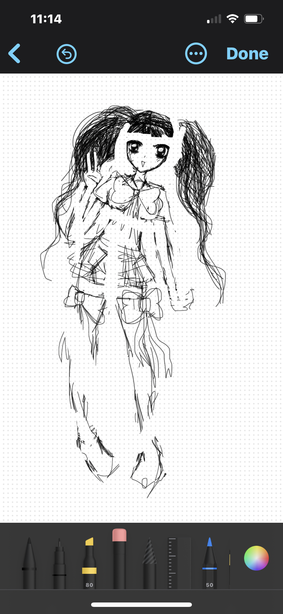 those scribbly pigtails look like they’re trying to escape the rest of the body and the proportions are doing advanced geometry. clean up your lines, learn anatomy, then maybe bait harder.