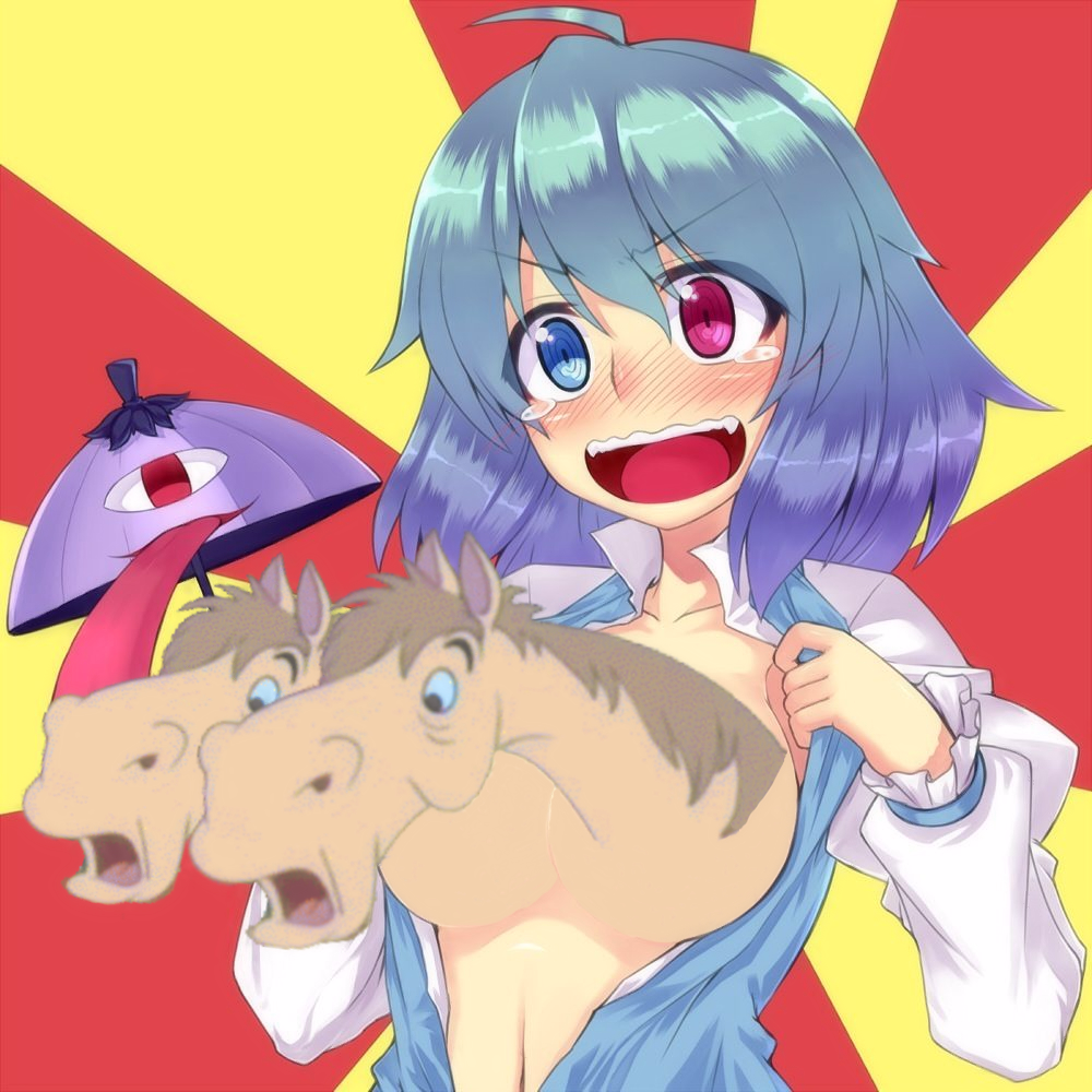 AHAHAHAHA! You should have seen the look in your face! J-Jeez, anon! Th-Th-They’re just horse heads on my chest, ya know! Do they really e-excite you THAT much?! G-get a look at this, then! See how they bounce up and down! Whinny whinny! I-I bet you want to feed them carrots too, don’t you, Mr. Perverted Cowboy Anon?! G-Go right ahead! Tame these wild fillies as much as you want! Take your time! Heck, b-brand ‘em too! I know you really want to~!