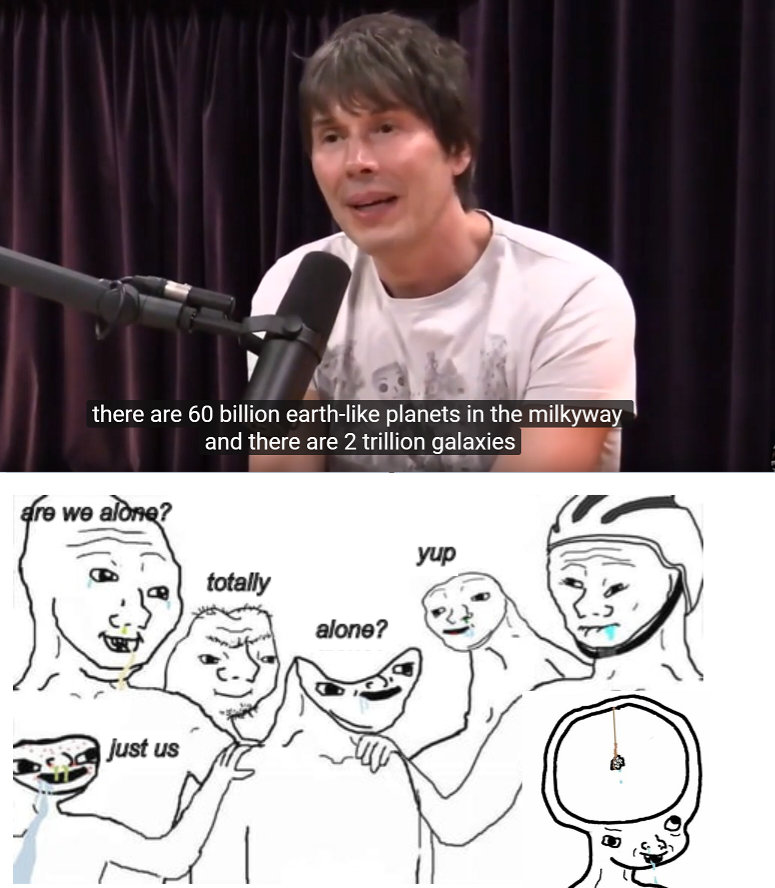 >big numbers dont mean anything Yes it does. They dont care if there is 2 million, 2 billion, 2 trillion, or 2x1024 galaxies, their argument would always be the same based on flawed reasoning, you could give literally any number for the age of the universe and the number of galaxies and it wouldn't matter (which is kinda embarassing for them when you put it this way)>Intelligent life is hardSee how they say hard instead of impossible. They cant say impossible because we are here, but they may as well just say it considering how for them the statistically low the odds are that we are the only ones here in the first place, which is contradictory in and on itself>fermi paradox says there should be conquered galaxies we would see by now"Hey bro, just colonize a 100 thousand light year territory and maintain it logistically". Empires on earth struggled to maintain itself with only 3 thousand miles expansion. >we cant see life or anything related anywhereWe can barely see planets surfaces on our own solar system or the bottom of our own oceans.>abiogenes is soo unlikely Yes, you are special. More likely you are one-in-a-septillion chance than the other way around.Their reasoning is so flawed that if we manage to find one more intelligent life elsewhere, it would change absolutely nothing in their point of view. They would just say "well it happened twice instead of once, still doesnt mean its common everywhere", or "well NOW we know we are not alone, so intelligent life is easy to occur". But it still wouldn't make sense from their perspective because once or twice is basically the exact same probability considering the size and age of the universe.And all that without even considering non tangible stuff like dark forest theory, non human intelligent life, etcWhat causes successfull and otherwise smart high IQ academia individuals to be blind (stupid?) to such simple common sense and logic, what is this phenomenon?
