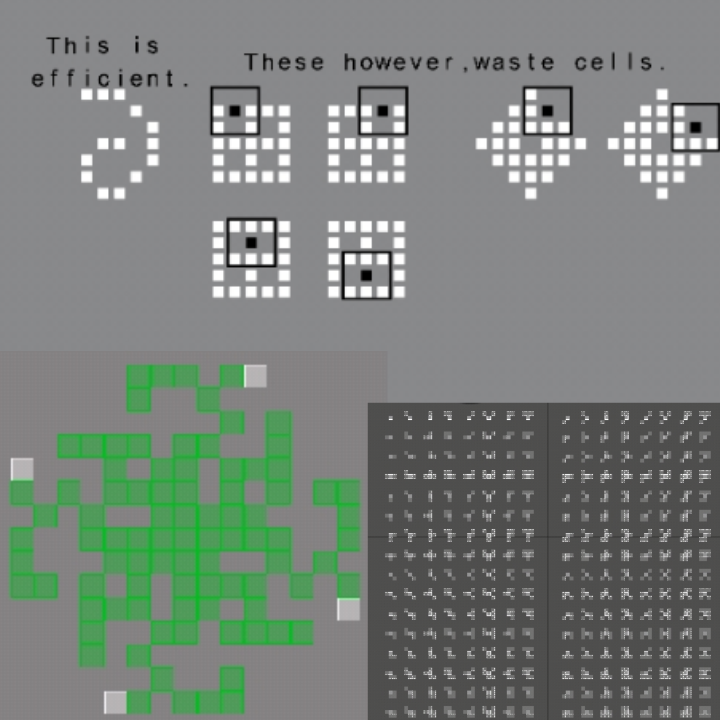 Suppose a structure made of 255 cells. Is it possible to arrange them in such a way where each cell has a unique neighborhood? The first structure is efficient because each cell is unique. But the second and third ones has similar shapes which means some cells aren't efficient enough. (First Image)I think I worded it weird so. What's the least amount of squares, structures, or rectangular area you need to make all 256 shapes? (Third Image, the square with no neighbours can be excluded of course.)I managed to get 89 of them (Green Cells, Second Image. Actually 90 if you include the neighbourless cell) but I don't know if the minimum really is 256THE HELL ARE THESE CAPTCHAS YOU PEOPLE ARE INSANE