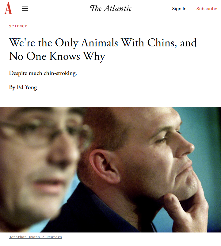 I came up with a theory for why humans have chins and other animals don't.No other presentation forms besides video available. Sorry if my accent is jarring to listen to, English isn't my first language and I'm not well adjusted to speaking it.Not really a "physics guy" either. Receptive to feedback.https://www.youtube.com/watch?v=8By13koVrns