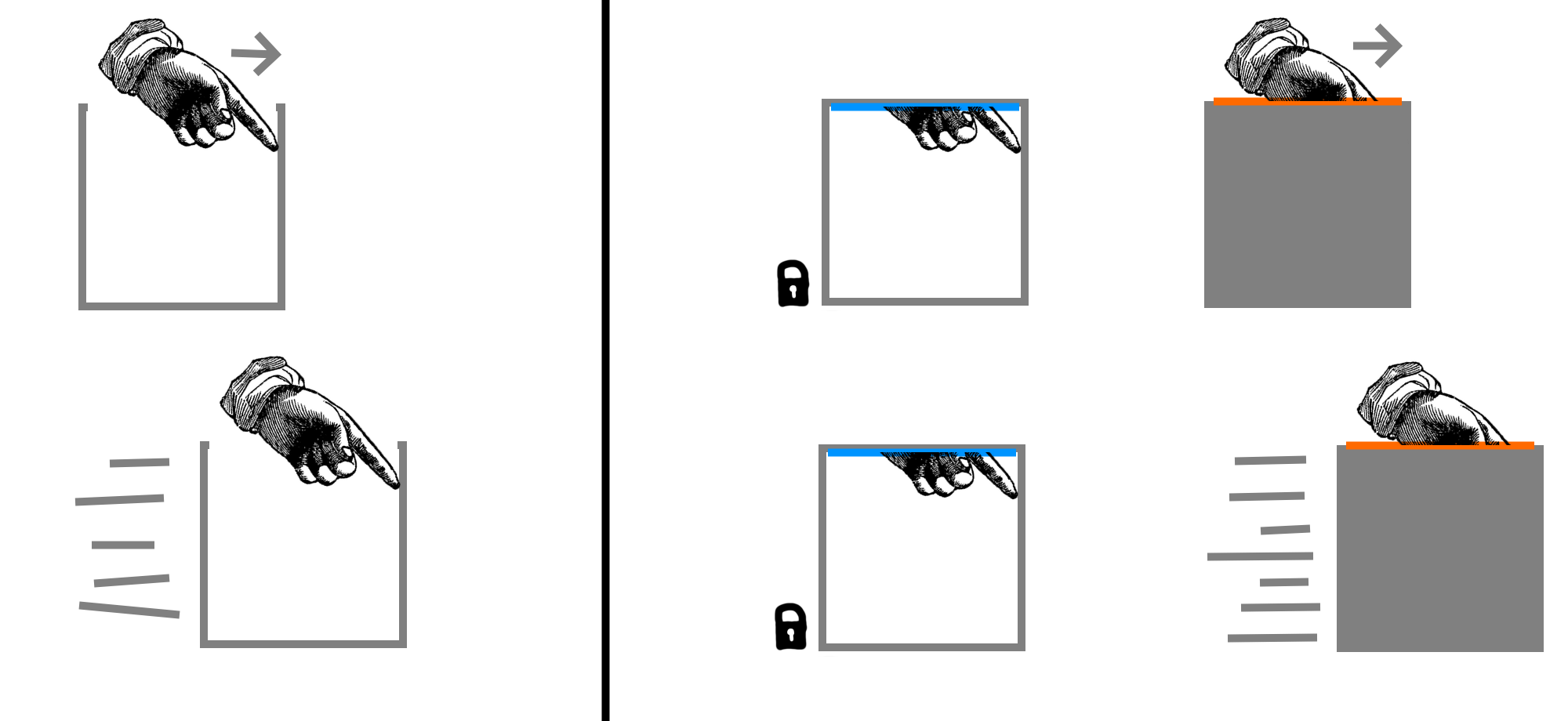 >>16873759Consider the case where the portals are different boxes. The orange box being the input would be stationary and it would be the blue box moving. The user would feel a tension on their arm and this motion of the blue box would be proportional to this tension. Something like a direct drive joystick could be created. Consider the case of a rod being inserted into the portals as shown where the ends of the rods are some interference fit - the rod is longer that the distance between the portals. One person held one end of the rod while the other one pushed them together.Does the rod fall over when they both let go?Inherent to the portal is a unique self-interference of portal-objects. The source of this interference originates from the portal, but the portal-object surface in question can be some distance away from the portal. In this case, the practicalities of tension make a perfect orientation unlikely and the rod is likely to tip by similar mechanisms of treefelling. But engineered geometries could create self-tension analogous to phase locking in superconduction.. The rod would not change orientation relative to the portals even if the box were tossed about. This would have to be outside of a strong gravitational field or other force acting non-uniformly on the rod. What happens if such a rod is set up as such in portals that are on plunging surfaces. What happens when the portals are brought closer together?
