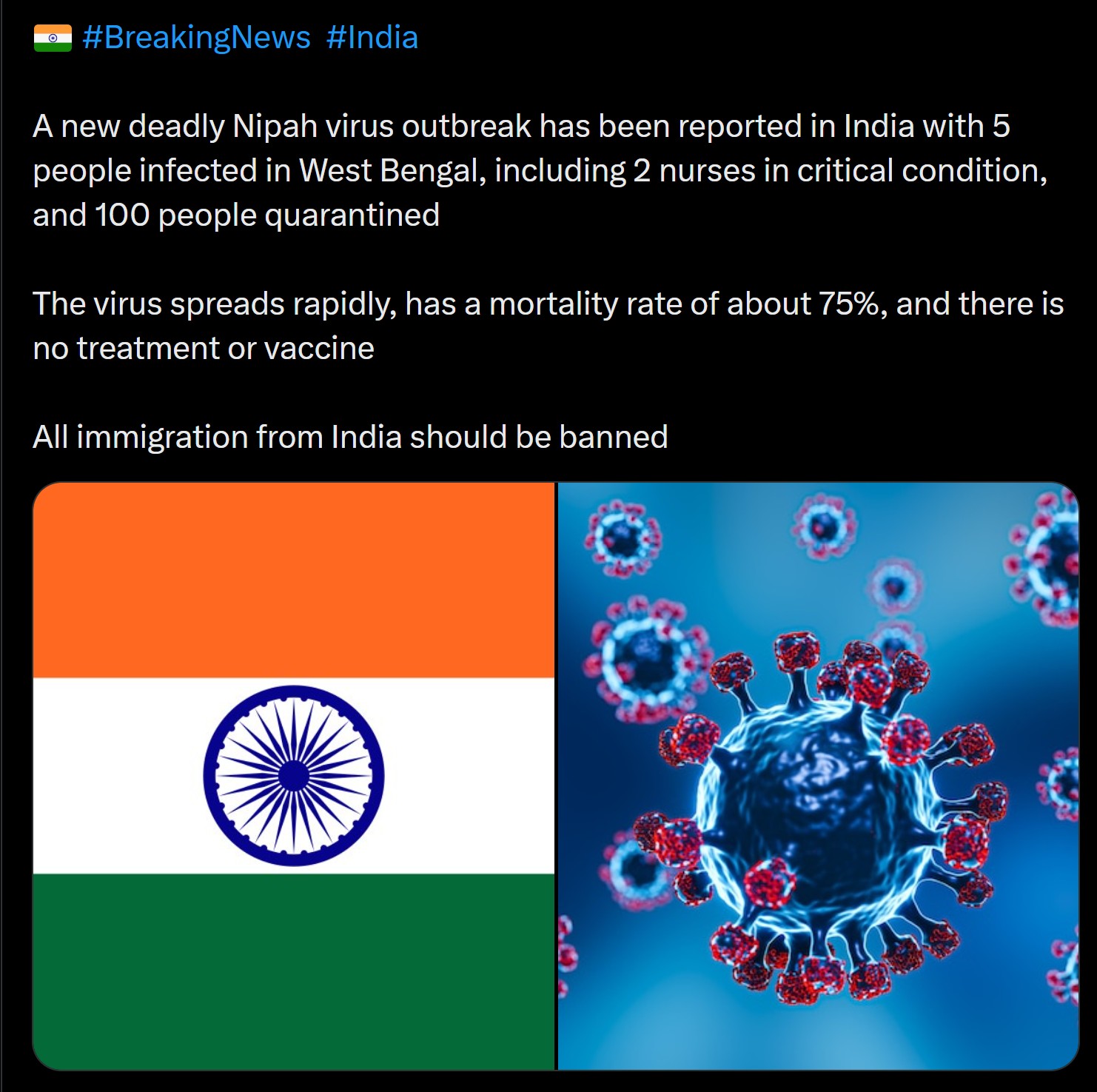There is currently a growing viral outbreak in india. It spread from animals and kills most people it infects.https://www.ndtv.com/health/how-nipah-virus-overwhelms-the-immune-system-and-turns-it-against-the-body-10924917January 2020 vibes. What are we going to do?