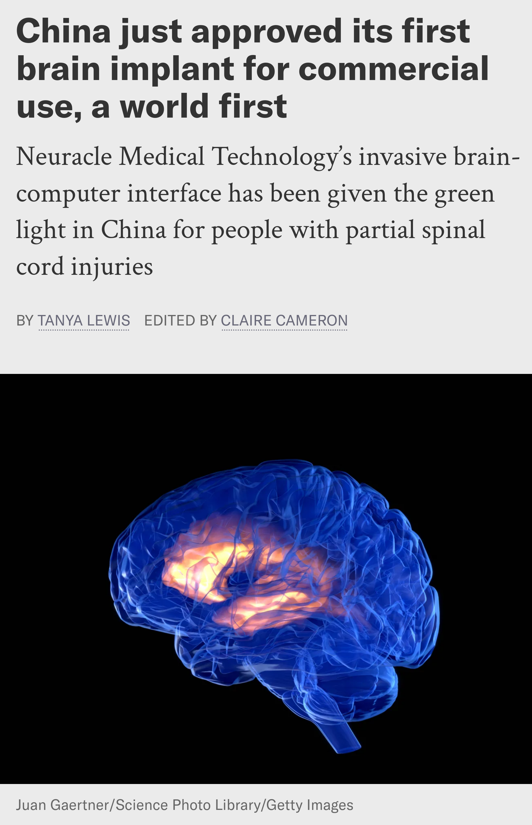 >Neuracle Medical Technology’s invasive brain-computer interface has been given the green light in China for people with partial spinal cord injurieshttps://www.scientificamerican.com/article/china-just-approved-its-first-brain-implant-for-commercial-use-a-world-first/