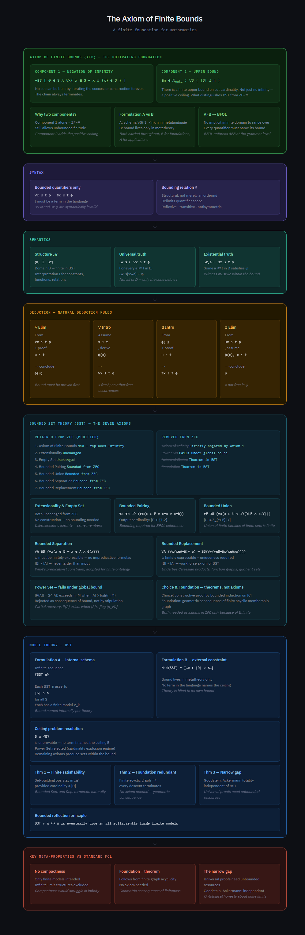 >be me>just a guy>notice that tools for modeling reality should probably be based on reality>reality is finite>so why does all of mathematics assume infinity exists>not prove it>assume it>and not even a recent assumption>predates written history>some prehistoric human looked at the horizon and thought "that goes on forever">we built calculus on it>decide infinity doesn't exist >and >that there is an upper bound>axiom>moving on>rebuild all of math>normal weekend>invent new logic where every quantifier must declare its finite range>turns out cleanerComment too long. Click here to view the full text.