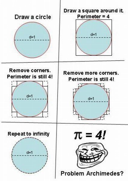 >>16827327Take a 4 inch string and wrap it around a 1 inch diameter pipe. If there's overlap then pi is less than 4.