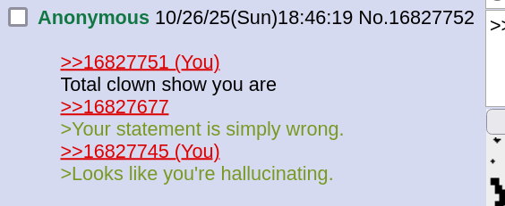 >>16827751Total clown show you are>>16827677>Your statement is simply wrong.>>16827745>Looks like you're hallucinating.
