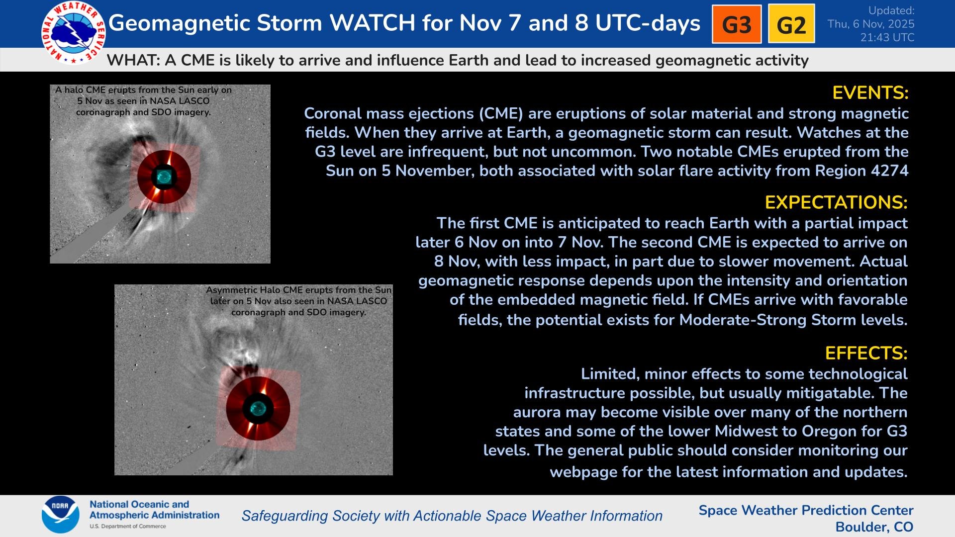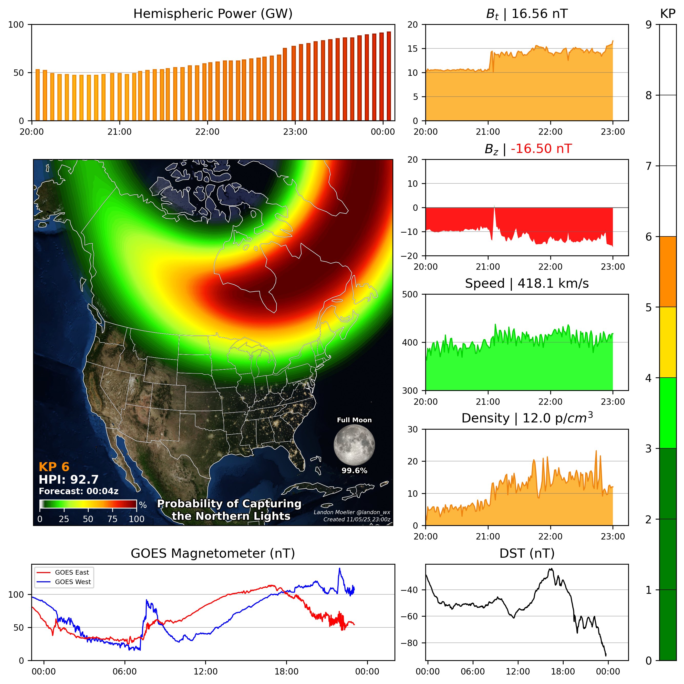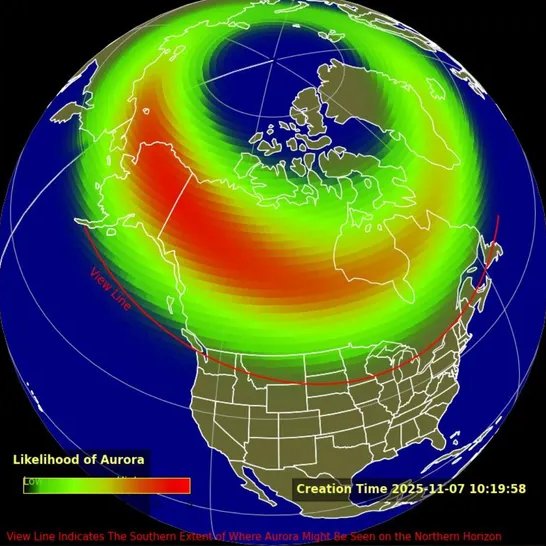 https://x.com/landon_wx/status/1986208806658011574>Large mid-latitude displays are possible this evening, but the aurora may be hard to see during recovery phase of substorms. Substorm pillars may appear as a very bright red to the naked eye.