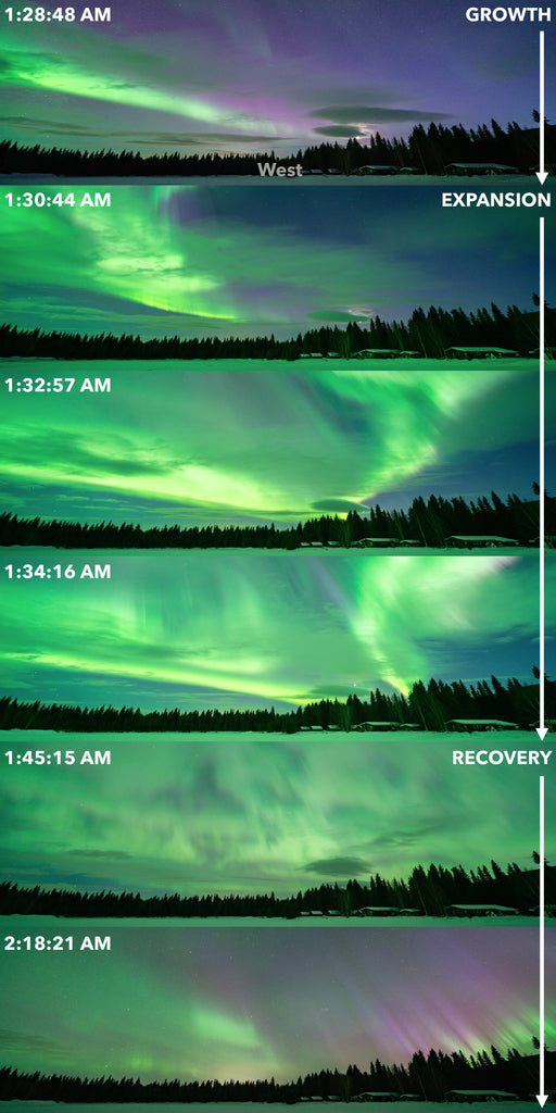 >A substorm, sometimes referred to as a magnetospheric substorm or an auroral substorm, is a brief disturbance in the Earth's magnetosphere that causes energy to be released from the "tail" of the magnetosphere and injected into the high latitude ionosphere. Visually, a substorm is seen as a sudden brightening and increased movement of auroral arcs.>Substorms are distinct from geomagnetic storms in that the latter take place over a period of several days, are observable from anywhere on Earth, inject a large number of ions into the outer radiation belt, and occur once or twice a month during the maximum of the solar cycle and a few times a year during solar minimum.>Substorms, on the other hand, take place over a period of a few hours, are observable primarily at the polar regions, do not inject many particles into the radiation belt, and are relatively frequent — often occurring only a few hours apart from each other.https://en.wikipedia.org/wiki/Substormhmm