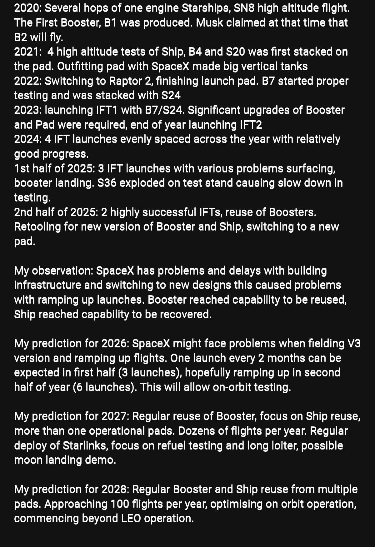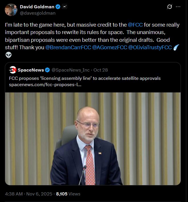 https://x.com/SciGuySpace/status/1986243900227363073>Crazy thing about the Viasat-3 launch tonight. It has a capacity of 1 terabit per second. Took 7 years and $700 million to build on contract by Boeing. Starlink v3 satellites have similar capacity. SpaceX will chuck dozens of them into space next year on every Starship launch.