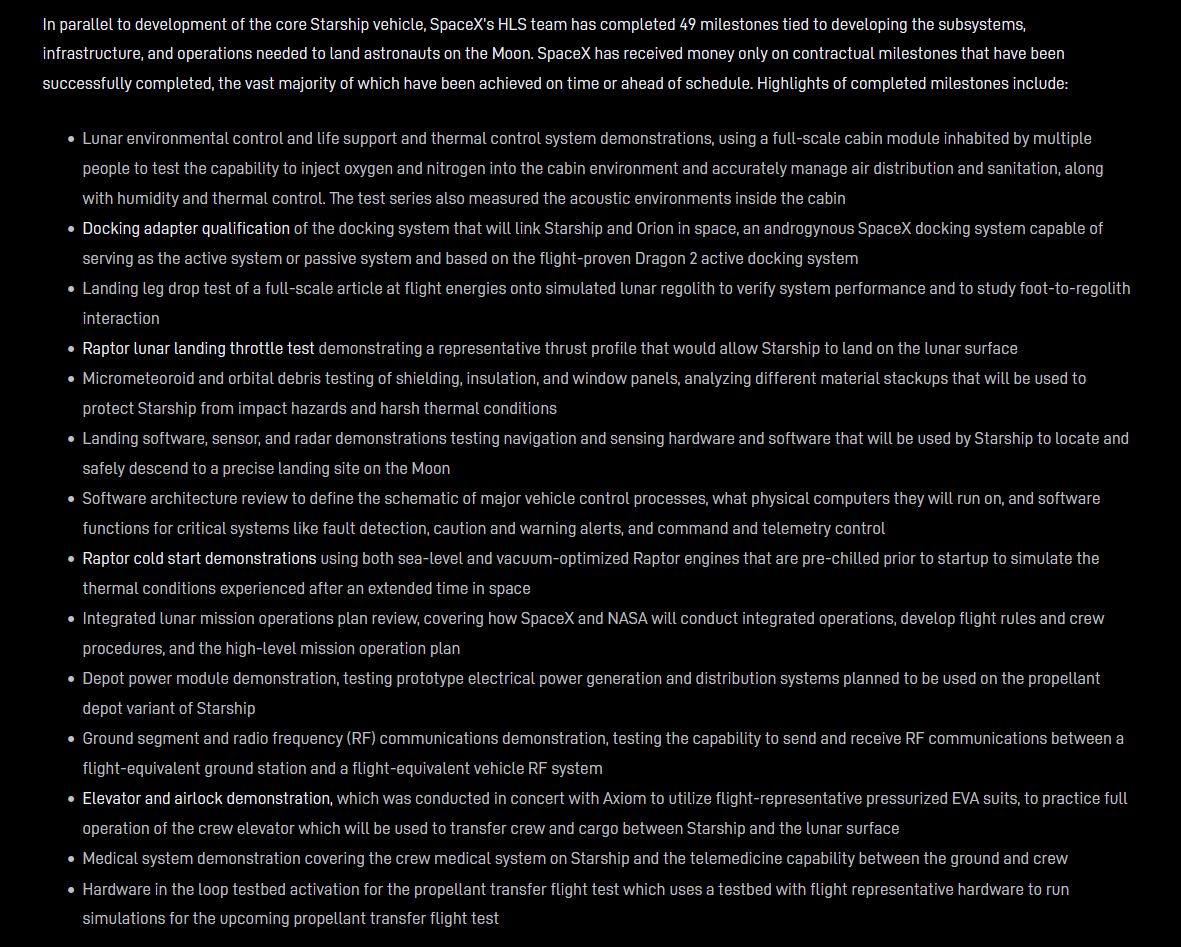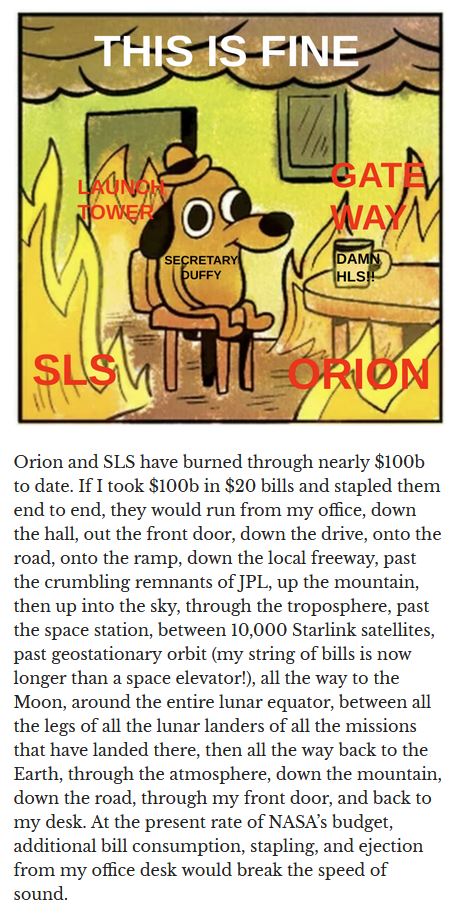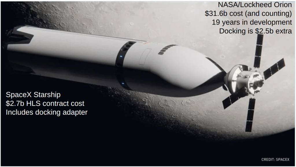 oldspace contractors have been scamming NASA for 100bil in 20 years and delivered one unmanned demo of a under-powered small capsule, which didn't even have the life support systems on board
