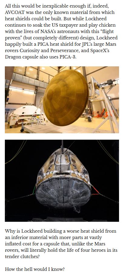 Fun Fact: Over at NSF an old space grumpy grandad acknowledged:>FYI I have worked on every American docking system to date. Artemis II does not have a docking system because A) it doesn't need one, and B) it has to drop the docking system for CG on re-entry. So putting one on A-II would be a massive waste of money.Meaning, reentry is even more iffy than you thought, if Orion is stuck in space there isn't even a slim chance of rescue and most importantly all Lockmart cares about is the dollar bills yo. Very comfortable with letting AIII go up with an amazing untested configuration.