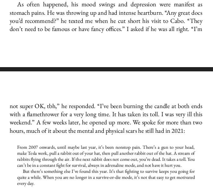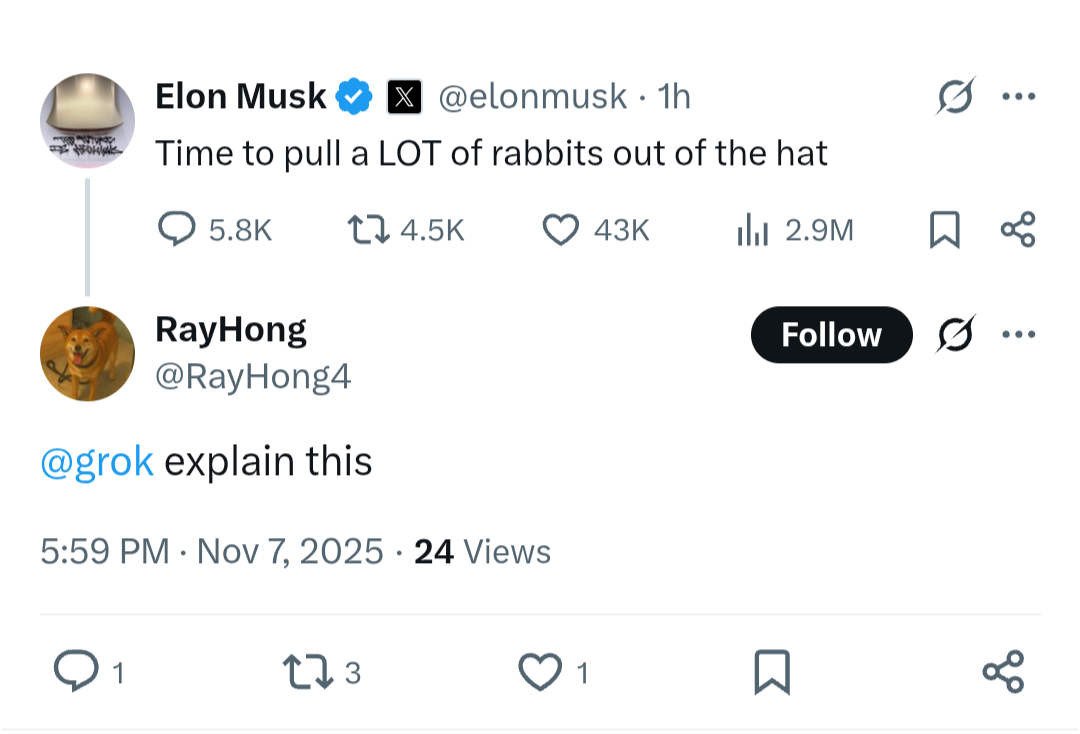 >>16839325In the Isaacson book he talked about how it feels like needs to keep pulling rabbits out of hats over and over or everything falls apart (this was back when SpaceX and Tesla weren't established yet). So he's pretty much just referencing that old line. So a mix of A and B