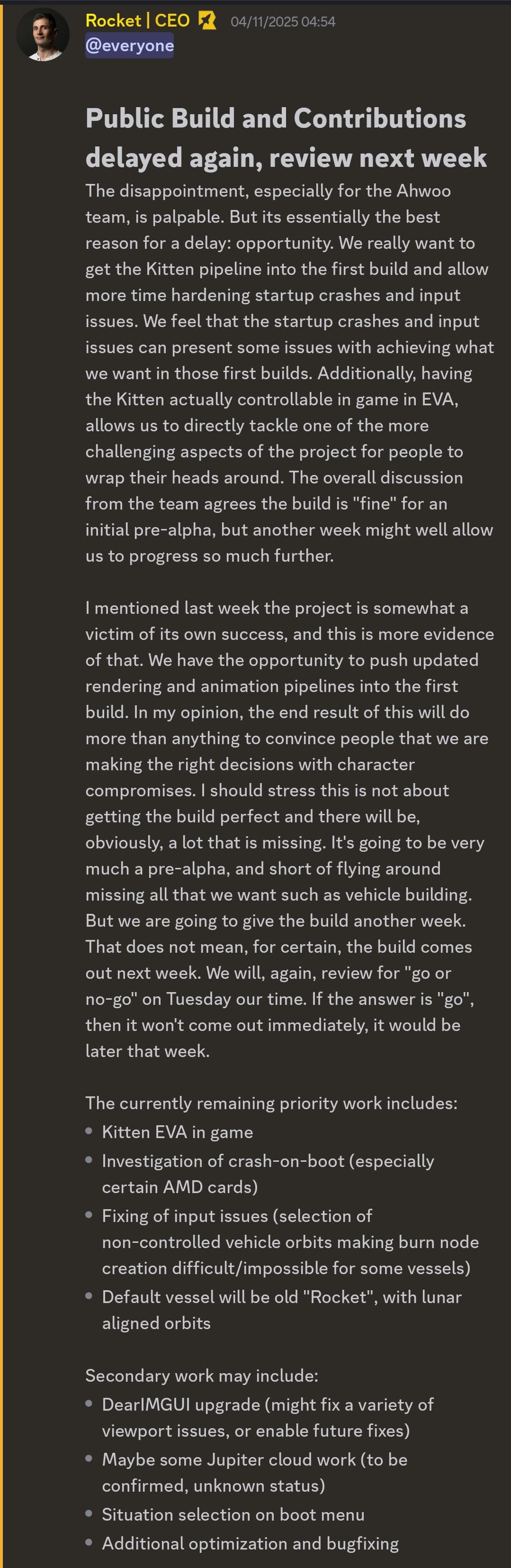 >>16838092>In an unfortunate series of errors, Chief Engineer, Bill Kerban, has accidentally slipped and fallen into the main Solid Propellant tank and was welded inside the chassis. We are currently assessing if his bodily composition will effect the critical Delta V needed for liftoff