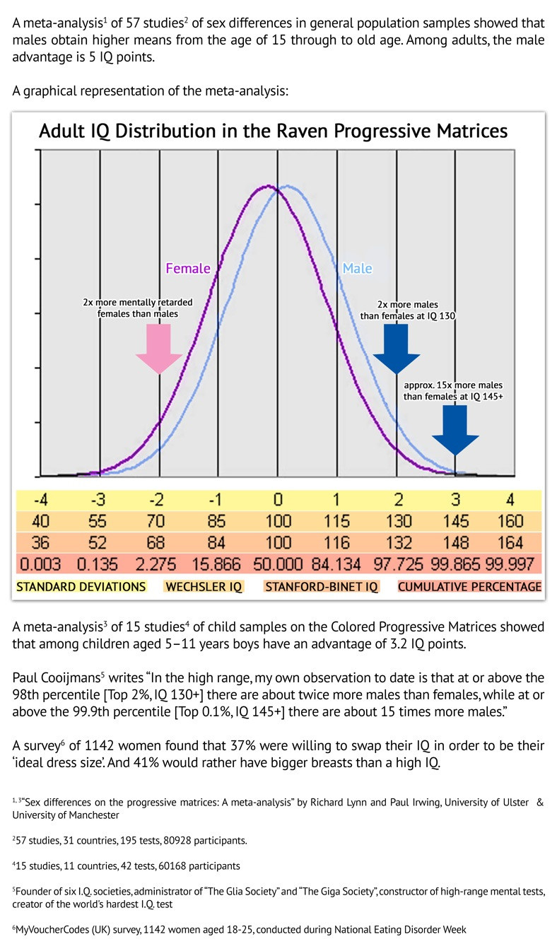 >>16845395To twist the knife even more. Your OP claims (without evidence) that the scientific consensus is that there are no IQ differences between men and women. This is not the scientific consensus. You made that up. Feel free to quote, in full, any sentence from any study you found and I'll explain to you how you misread it. I'll accept continuation of no comments as a formal concession. Your move, chief.