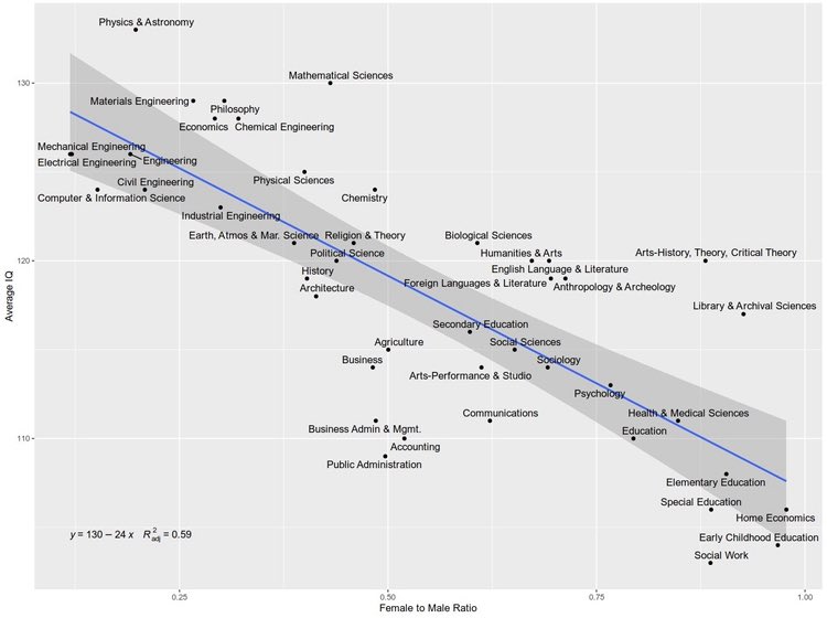 Despite headlines about more female participation in higher education there still exist a clear negative correlation between a field’s female-to-male ratio and its average IQ.