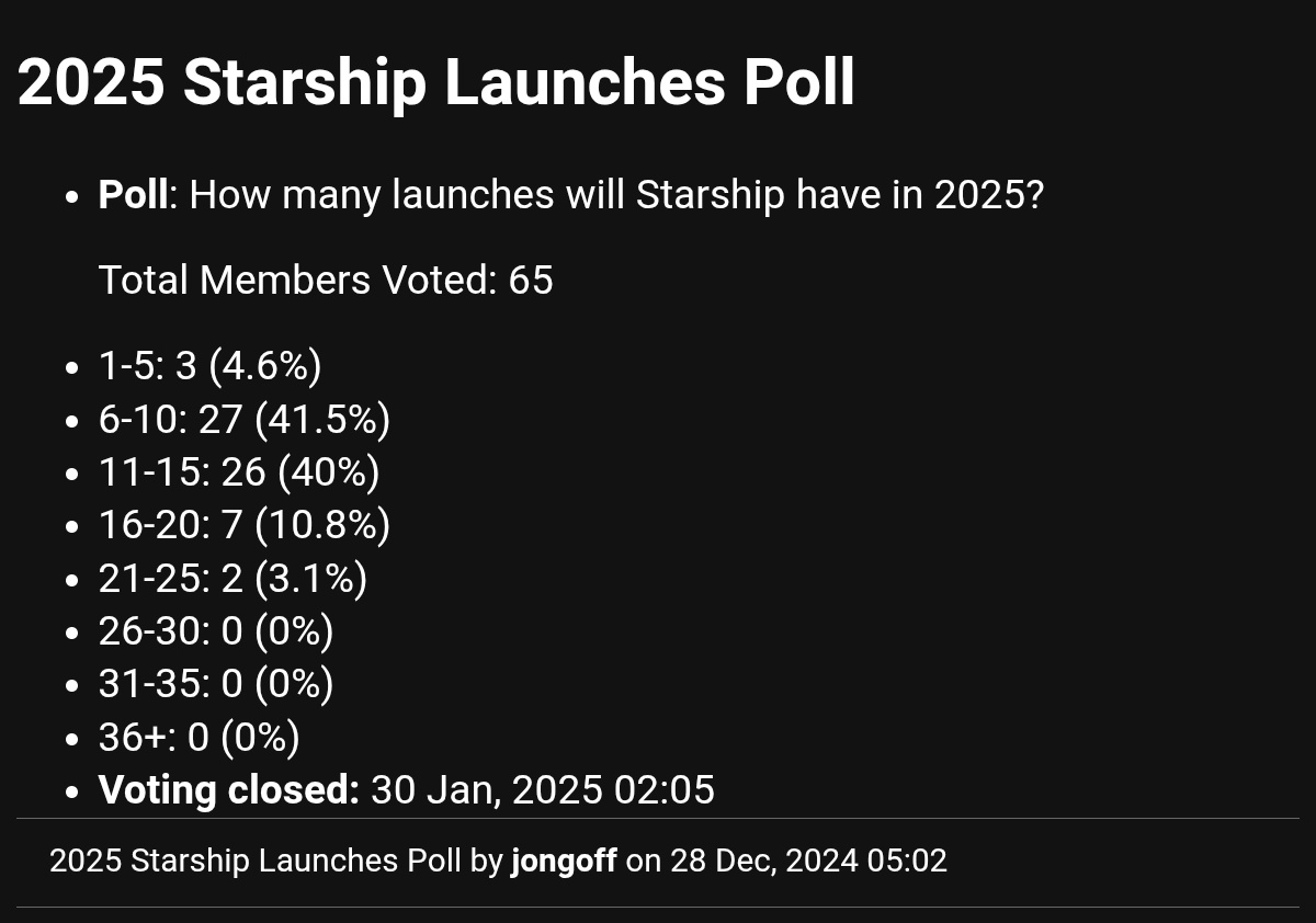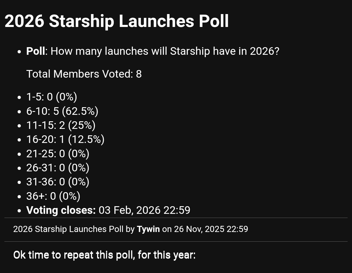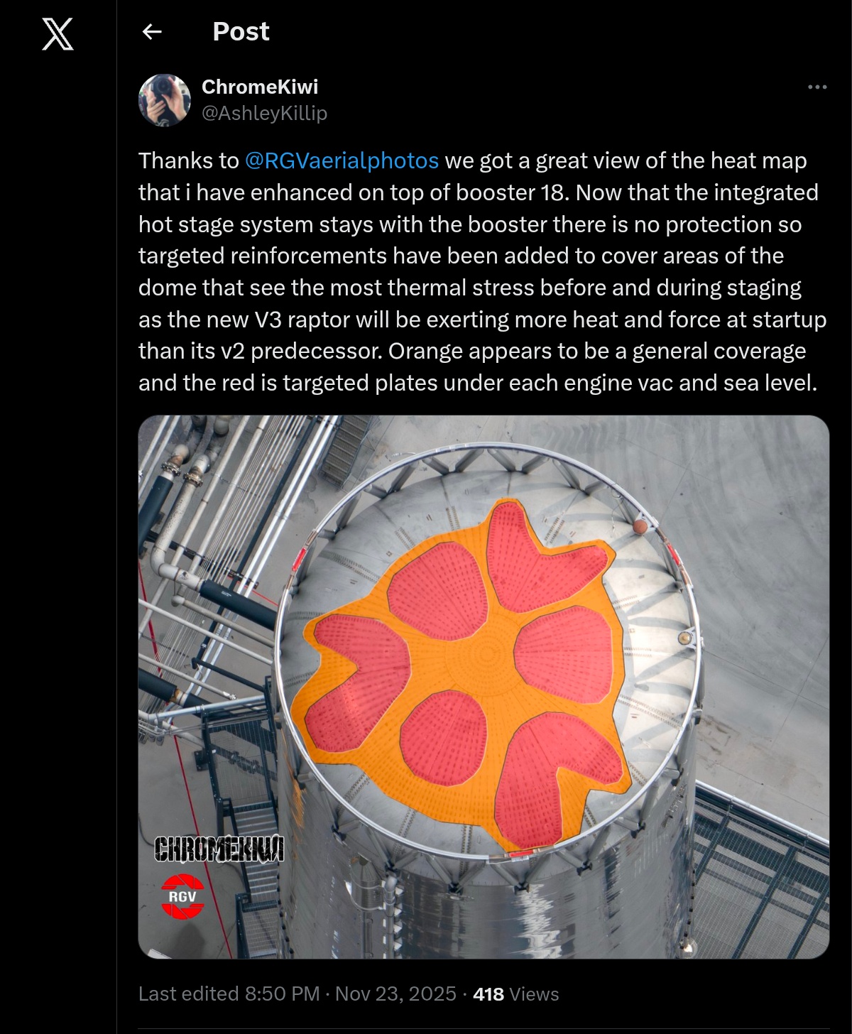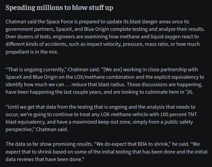 >June 2025: To address the issue, COPVs on upcoming flights will operate at a reduced pressure with additional inspections and proof tests added prior to loading reactive propellants onto a vehicle. SpaceX has also updated its COPV acceptance criteria and developed a new non-destructive evaluation method to detect internal COPV damage. New external covers are also being added to COPVs during their integration, adding an additional layer of protection and visual indication of potential damage. Every lesson learned, through both flight and ground testing, continues to feed directly into designs for the next generation of Starship and Super Heavy.*explodes again*