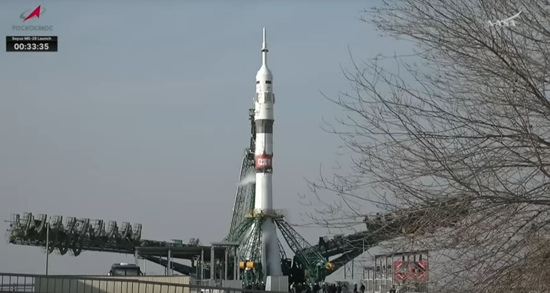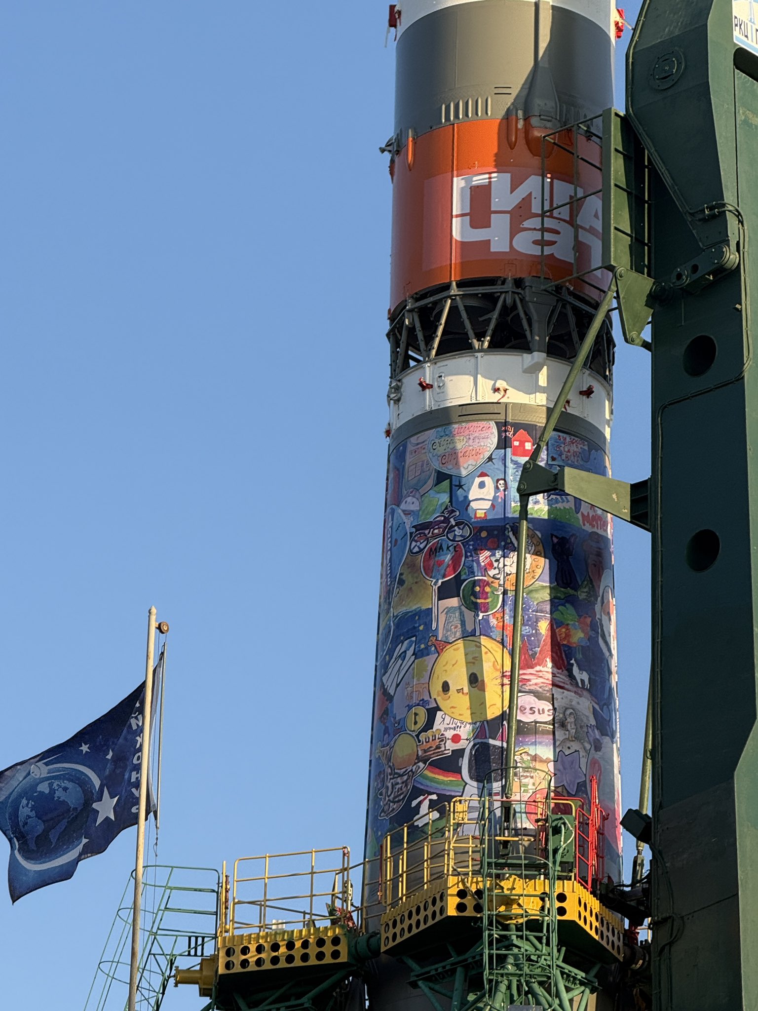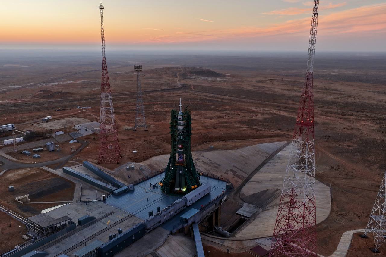 >The Soyuz rolled to the pad this morning Baikonur style: carried horizontally on a railcar, gliding across the steppe at sunrise. At the pad, hydraulic arms lift it upright and the four counterweighted “tulip” petals close around the base. There are no hold-down bolts—at ignition the rocket simply rises, pushing the petals open as it climbs. Excited to share thanksgiving with @Astro_ChrisW right here!lol, they got kids to paint the rocketquite cutehttps://x.com/astro_anil/status/1992851427006308610?s=20