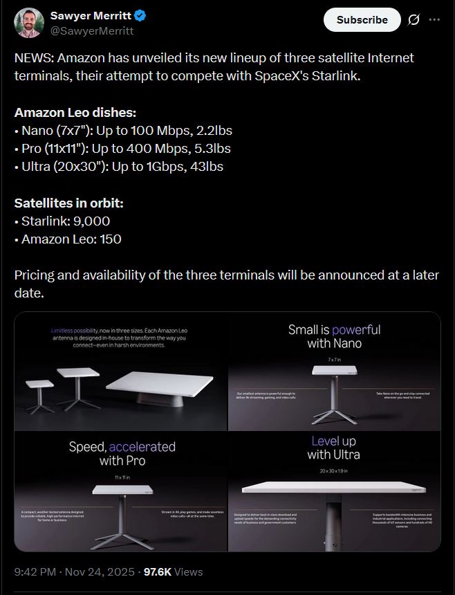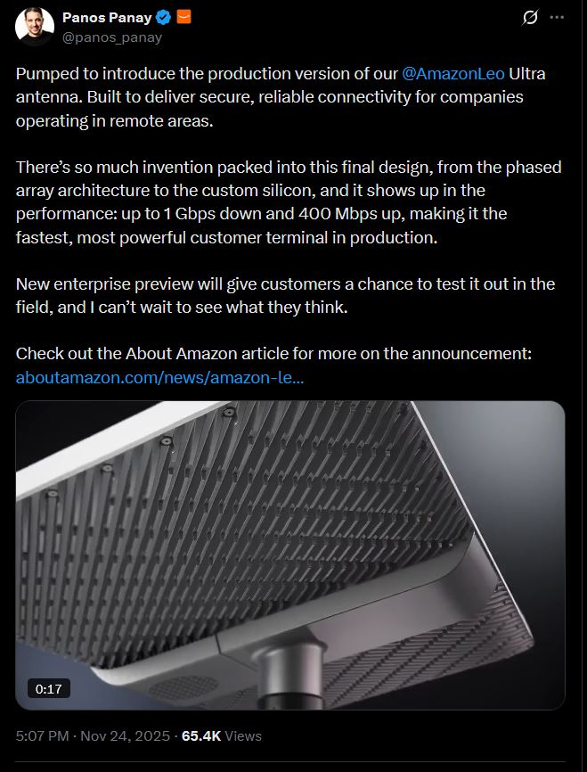 >>16856245https://www.aboutamazon.com/news/amazon-leo/amazon-leo-satellite-internet-ultra-pro>The full-duplex phased array antenna provides download speeds of up to 1 Gbps and upload speeds up to 400 Mbps, making it the fastest commercial phased array antenna in production.https://www.youtube.com/watch?v=DPd0wsXFlUo