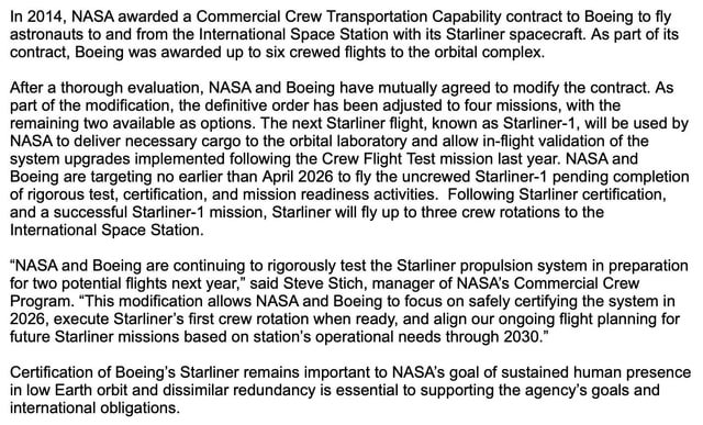 >Starliner-1, is now officially a cargo mission (instead of a crewed flight) no earlier than April 2026.