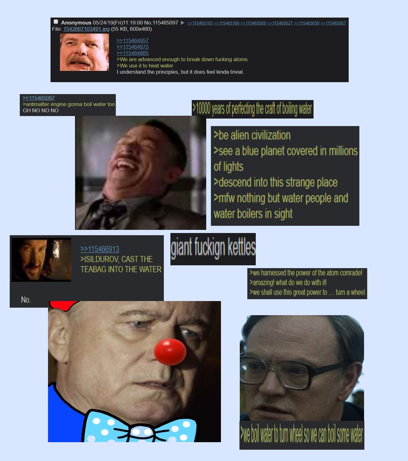 >>16859425Humanity's greatest achievement.Learning how to boil water to turn a wheel.