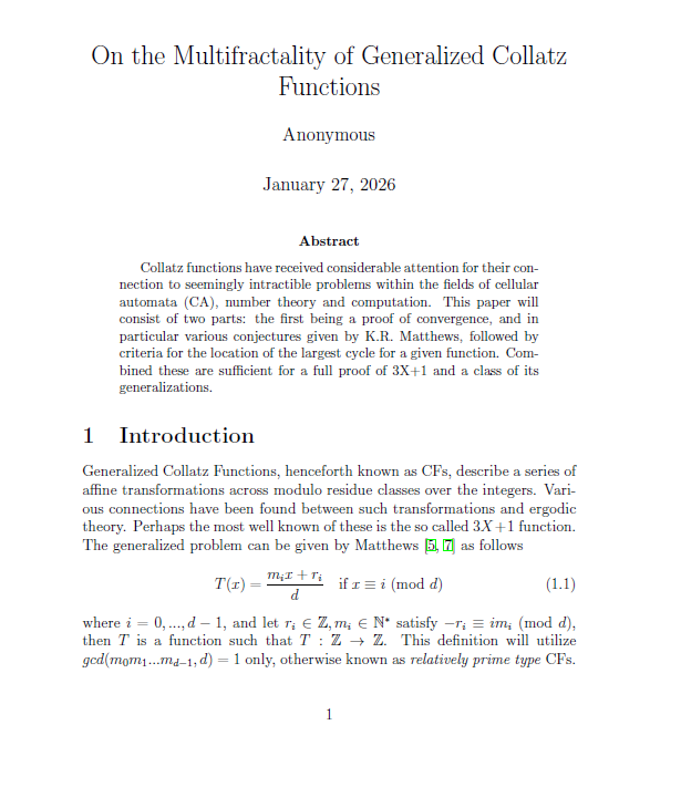 I have solved the Collatz problem, and I can post the paper here if people so wish, though I warn it's not written very well. Turns out it has a multifractal spectrum, which is basically a fractal with an infinite number of possible scaling dimensions. A "monofractal" has only 1 scaling dimensions typically.