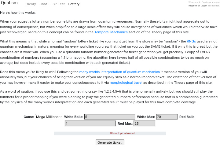 https://quatism.com/lottery.htmAlso thishttps://qrng.anu.edu.au/random-permutations/set number of permutations to 1Set Number of objects in each permutation to 69screenshot first 5 numbers on top left that come right after :Those are your white ballsset number of permutations to 1Set Number of objects in each permutation to 26screenshot first number on top left that come right after :That is your red ballWhen you request a lottery number some bits are drawn from quantum divergences. Normally these bits might just aggregate out to nothing of consequence, but when amplified to a large-scale effect they will cause divergences of worldlines which would otherwise have just reconverged. More on this concept can be found in the Temporal Mechanics section of the Theory page of this site.What this means is that while a normal "random" lottery ticket like you might get from the store may be "random" - the RNGs used are not quantum mechanical in nature, meaning for every worldline you drew that ticket on you got the SAME ticket. If it wins this is great, but the chances are it won't win. When you use a quantum random number generator for ticket generation you get precisely 1 copy of EVERY combination of numbers