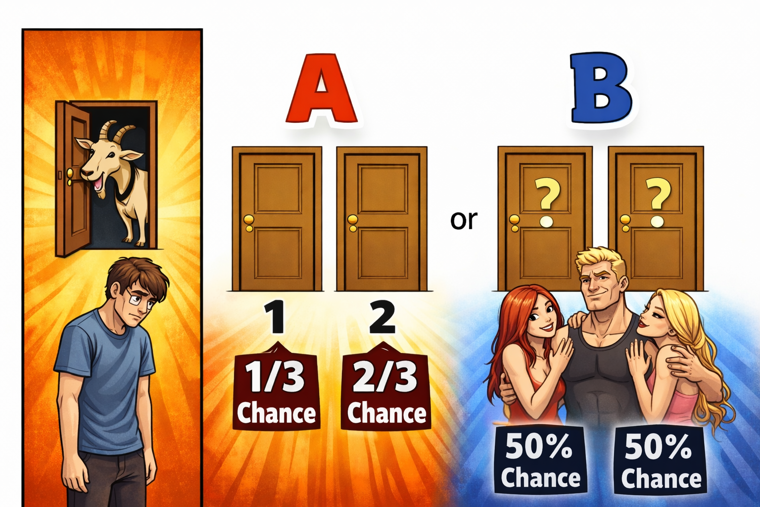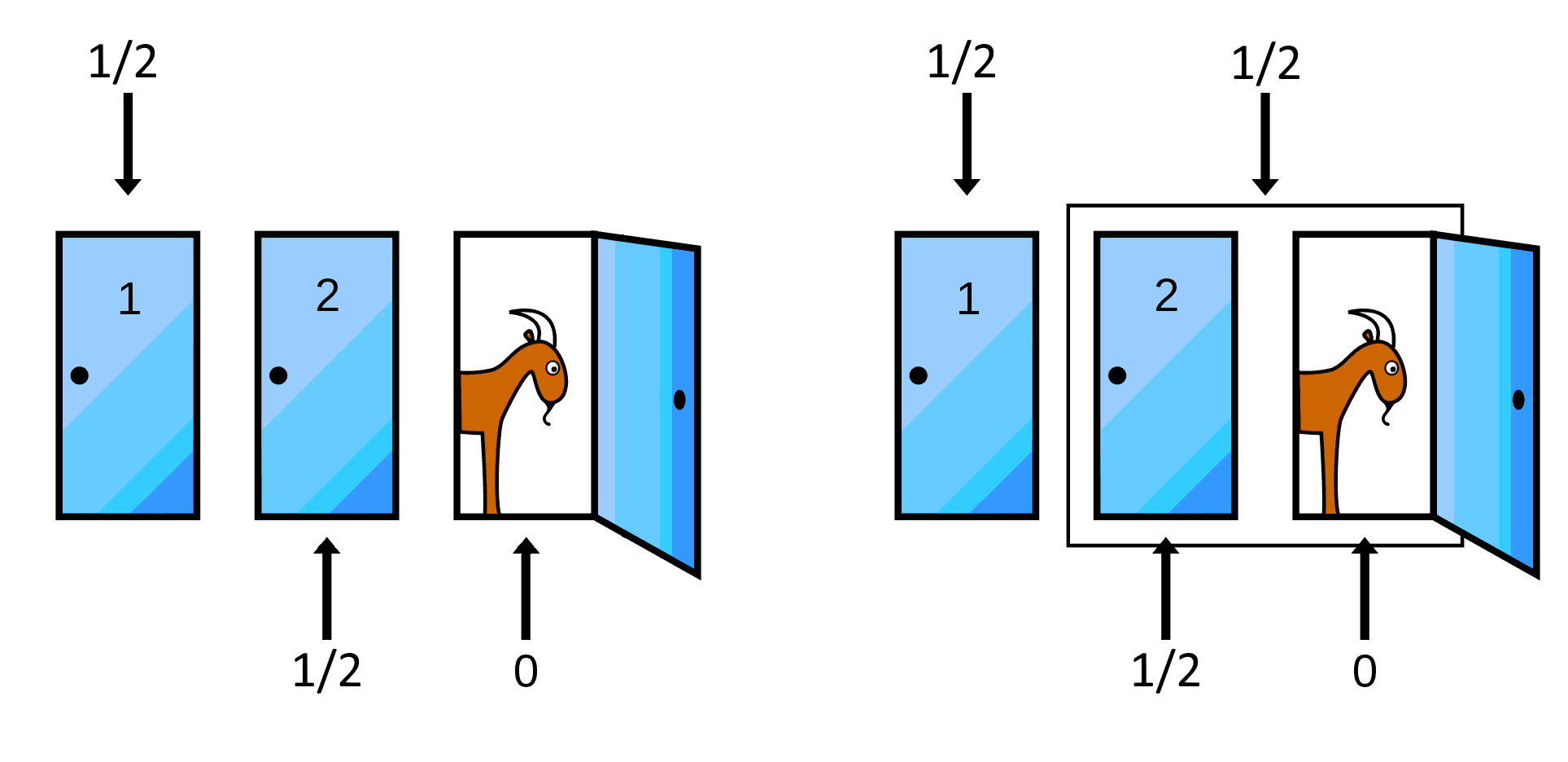 >>16887715>>16887842Anyway, assuming we're still talking about >>16884726 then it's 1% vs. 99%, which adds up to 100%, like it should.But if Monty opened the doors randomly and happened not to reveal any goats, it's 50% vs. 50%. Likewise if there were only ever two doors to begin with and you're picking for the first time.