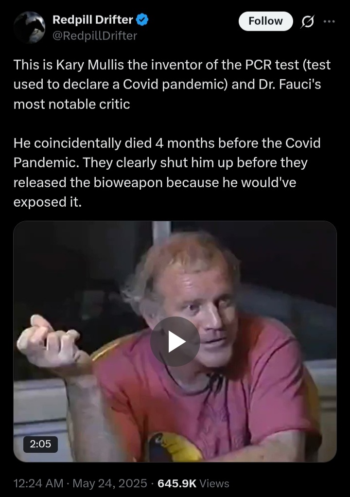 Kary Banks Mullis was an American biochemist who invented the polymerase chain reaction (PCR) in 1983, revolutionizing DNA amplification for genetics, forensics, and medicine. He won the 1993 Nobel Prize in Chemistry (shared) and the Japan Prize.Regarding PCR during pandemic (which he _weirdly_ died before witnessing), Mullis stated the technique amplifies DNA exquisitely but doesnt tell you that you are sick/infected or prove causation/infectivity alone. He warned against misinterpreting high-cycle results (like detecting non-viable fragments), a point often cited (and debated) in discussions of pandemic case inflation via cycle thresholds.His warnings were largely confirmed by 2025 Güntheret al studyhttps://www.frontiersin.org/journals/epidemiology/articles/10.3389/fepid.2025.1592629/fullThis study models nationwide PCR and IgG data, estimating only 14% (kek) of PCR-positive tests reflected actual infections triggering detectable antibodies. This implies 86% overestimation of infections which proves PCR tests absolutely useless. PCR detected non-infectious viral fragments, inflating case counts and undermining pandemic policies reliant on PCR incidence. It means that up to 90% of people diagnozed during "pandemic" as covid infected were not infected by SARS-CoV-2 virus at all.Vid-rel: one of Mullis last interviews about Fauci:https://x.com/RedpillDrifter/status/1926041698834031002He died shortly after giving this interview, few months before the "covid-19 pandemic".