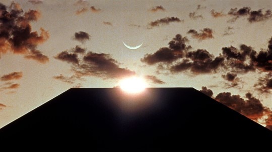 It started out a lot bigger than the sun, moves away from Earth at about 3.8 centimetres each year. Just when it balanced, then man could work out the geometry of the monolith the apes couldn't.