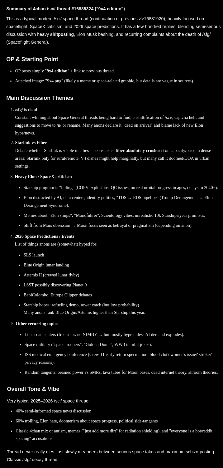 >>16888874No meaningful progress from SpaceX. Lots of Shitlinks. Blue Origin's engine blew up on teststand. Artemis II. No talk of Artemis III (forbidden subject). No prop transfer demo in 2026. Nancy Roman Space Telescope has been built.