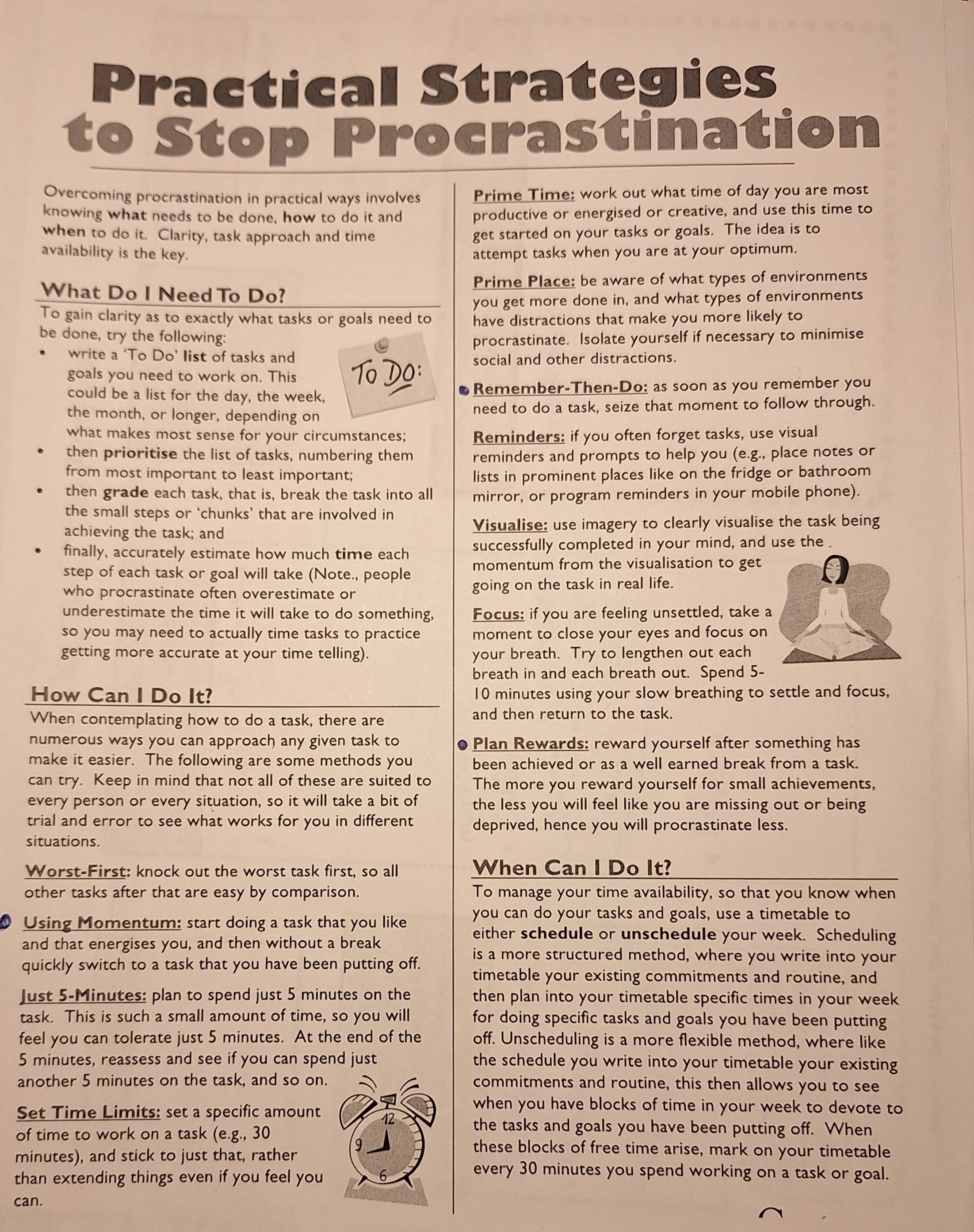 >>16910063>How do anons with adhd manage to stay motivated and disciplined?I treat motivation as a resource that is depleted daily and is not to be relied on.I do allow myself to let my interest carry me and get lost in whatever I want to learn about in the moment. But also I have practiced setting boundaries with myself "I'll play until I finish this part of the quest", practiced using the Stop skill, I tell other people about small accomplishments and force myself to be cheery and proud about it even if it's a tiny step forward.It's not a one-time thing. Sometimes I'll stop myself, get distracted again, stop, distracted, stop, finally productive. Be kind to yourself if you don't strictly meet the numeric goal you set, it's alright, you're making a genuine effort and it shows.It's not just you, procrastination and discipline are some of the biggest struggles for us.If you feel you can't do an hour at once, maybe try being satisfied with 15 minutes or one practice question and feeling good about it. Then if you get stressed about how 15 mins was not good enough because it's not an hour, tell yourself it's okay to feel that way and be aware of it for a few moments, then move on.Having a habit or routine (doesn't have to be an everyday thing) will make things much easier as far as not having to rely on motivation. It gets easier.Take my advice with a grain of salt though, I'm a 3 time dropout from severe procrastination issues in the past. I'm excited to take on the academic world again now that I have ways to set myself up for success instead of last minute catastrophes (sometimes inevitable, that's alright).I'll post a picture of a procrastination advice sheet I got. (later)And that's really cool how you got carried away for many hours doing something that suddenly catches your specific interests <3For me it's disaster breakdowns, inventions, and languages