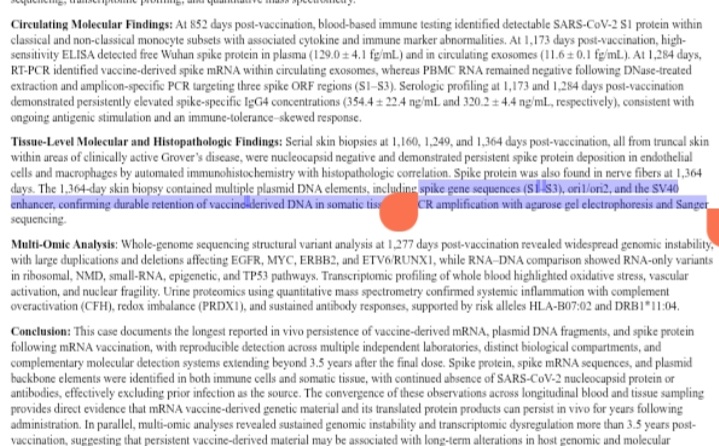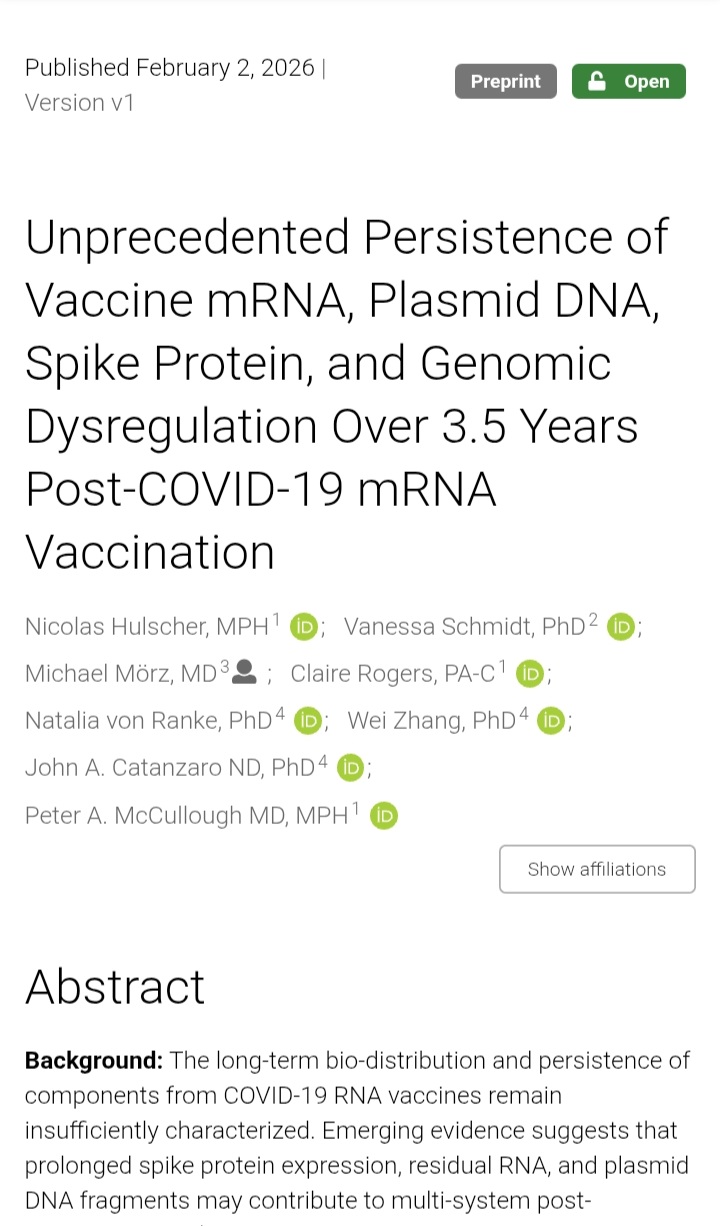 The paper titled "Unprecedented Persistence of Vaccine mRNA, Plasmid DNA, Spike Protein, and Genomic Dysregulation Over 3.5 Years Post-COVID-19 mRNA Vaccination,” presents the most comprehensive COVID-19 vaccine injury case report to date involving >40 emergency department visits, >200 specialist encounters across 18 medical disciplines, >100 laboratory investigations, >100 imaging studies, and serial blood and tissue sampling performed at multiple timepoints over more than 3.5 years.The findings reveal longitudinal molecular evidence that vaccine-derived mRNA, plasmid DNA fragments, and spike protein persist in human blood and tissue more than 3.5 years after vaccination independently confirmed across multiple laboratories using diverse analytical methods.https://zenodo.org/records/18460099Authors suggest that injection with modRNA/LNP gene therapy leads to permanent genomic instability and transcriptomic dysregulation, meanwhile vaccine-derived mRNA, plasmid DNA fragments, and spike protein following mRNA vaccination persist in body for long years.Authors employed ELISA and immunohistochemistry for spike protein detection; RT-PCR, PCR with Sanger sequencing for vaccine mRNA and plasmid DNA; whole-genome sequencing, transcriptomic profiling, and mass spectrometry for genomic dysregulation.This persistence defies expected rapid vaccine clearance, risking chronic inflammation, genomic instability (variants in cancer-related genes), and multi-system disorders, warranting scrutiny of long-term vaccine safety.
