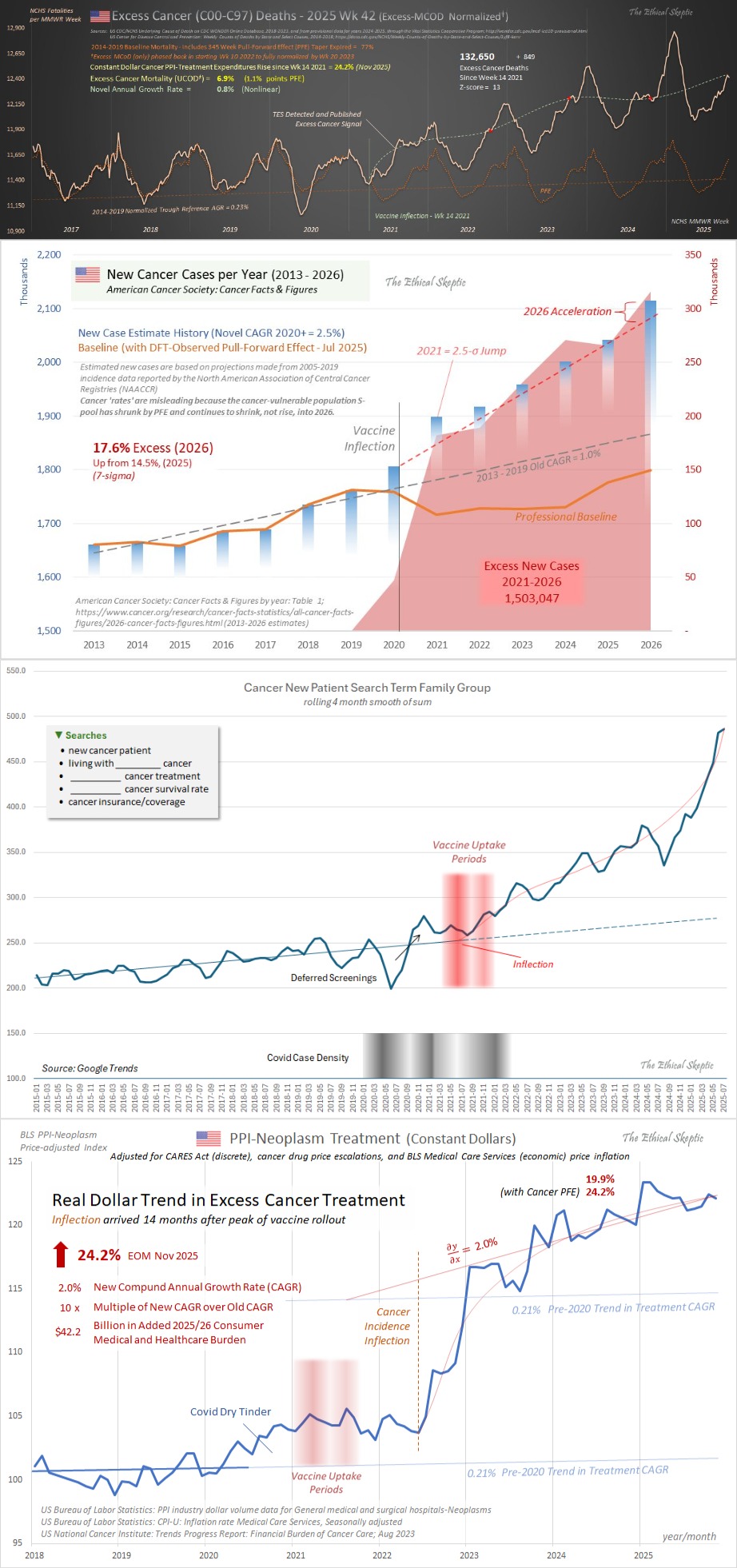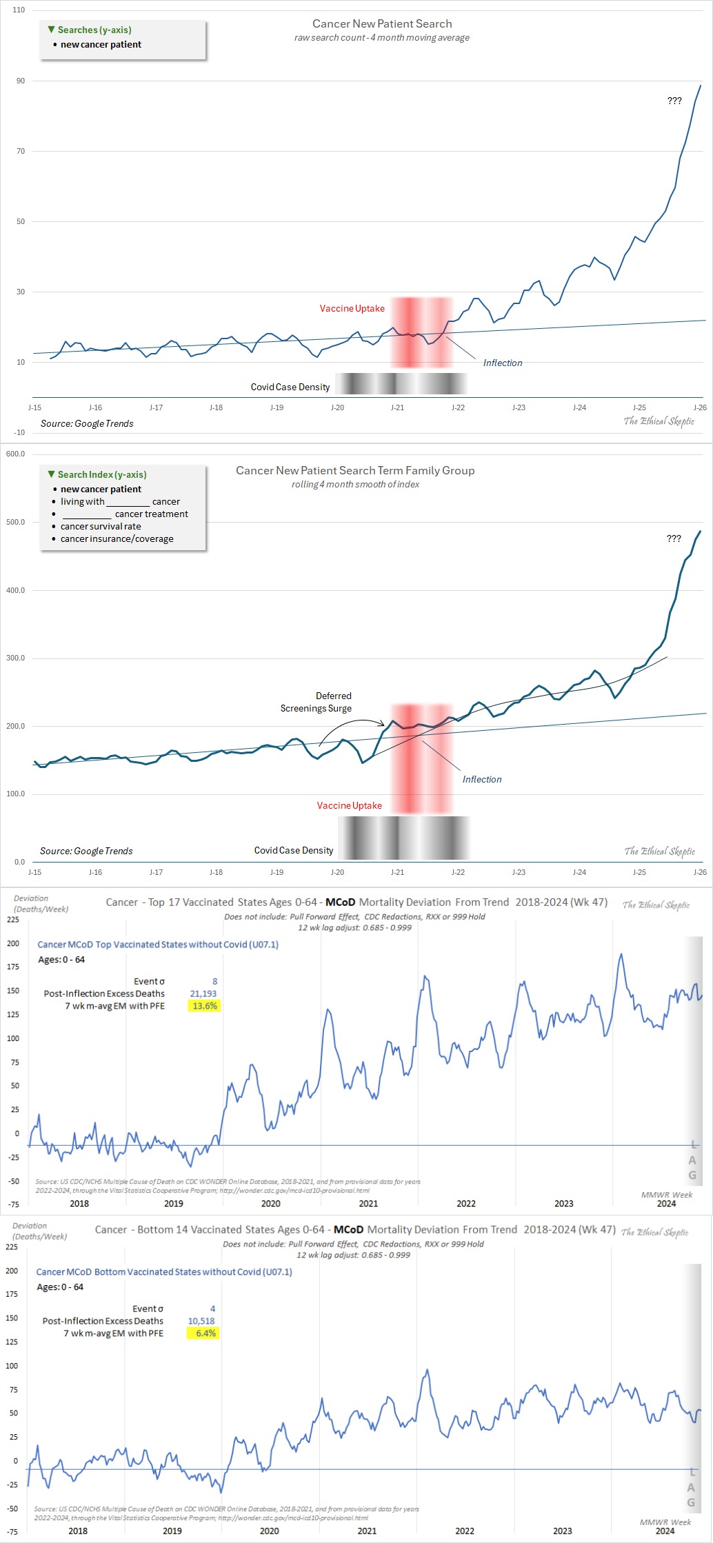 First graph : New Cancer Patient SearchesSecond graph: Cancer Novel Circumstance Search Familyhttps://x.com/EthicalSkeptic/status/2019889156868972623The sharp, sustained post-2021 surge in "New Cancer Patient" and "Cancer Novel Circumstance" Google searches signals a real increase in new diagnoses, especially aggressive/unusual ("turbo") cancers, correlating with vaccine rollout, not COVID infections. This aligns with rising excess cancer mortality, treatment costs, and young-onset cases, indicating a potential public health crisisThird graph: MCoD Mortality Deviation From Trend for top 17 vaccinated states.Fourth graph: MCoD Mortality Deviation From Trend for bottom 14 vaccinated stateshttps://x.com/EthicalSkeptic/status/20199288434491682472x excess in high-vax states (despite lower infections) as vaccine-driven, aligns with vax-induced cancer claims.