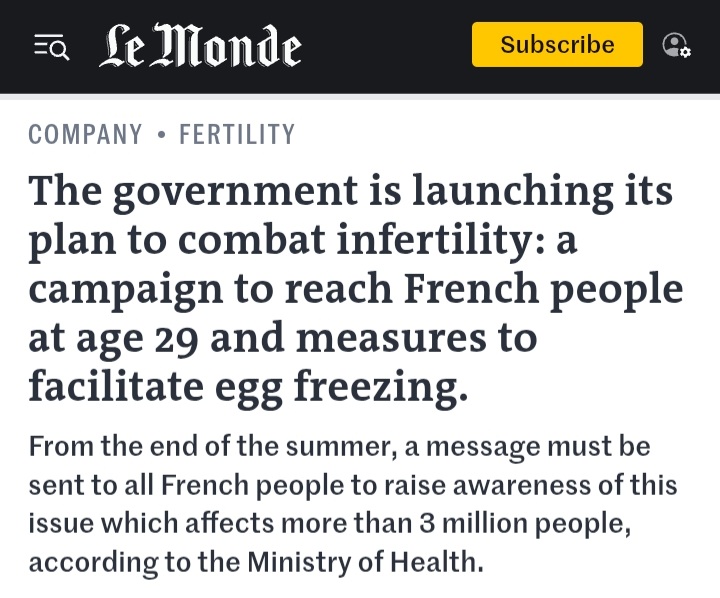 >>16905439France just launched its 2026 fertility campaign. The campaign includes sending letters to all 29-year-olds urging awareness of reproductive health and options like egg freezing, addresses rapidly declining birth rates after covid pandemic.https://www.lemonde.fr/societe/article/2026/02/05/infertilite-le-gouvernement-lance-son-plan-apres-des-annees-d-attente-et-envisage-d-ecrire-aux-francais-a-leurs-29-ans_6665537_3224.htmlFrench TFR rates collapsed in unprecedented way from 1.82 in 2020 to 1.56 in 2025 (lowest since WWI)The French campaign also pays attention to rapidly declining egg/sperm quality.Unfortunately and expectedly, the French government refuses to investigate real causes of such rapid fertility drop. xD