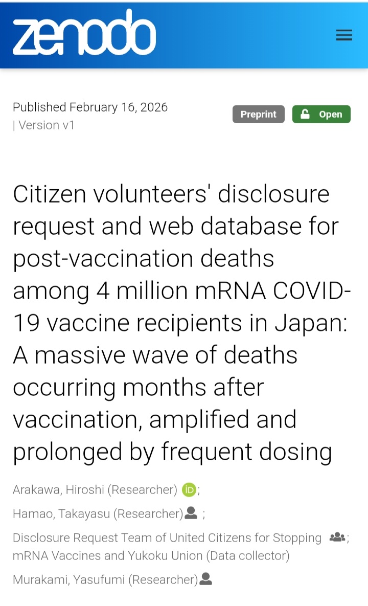 This citizen-led preprint published today by researchers including Yasufumi Murakami, analyzes municipal data collected via disclosure requests from volunteers. It covers 4,025,948 individuals in Japan who received 17.5 million mRNA COVID-19 vaccine doses (up to 8 doses per person) from 2021-2024.https://zenodo.org/records/18649880The most disturbing claims center on a "massive wave" of deaths peaking several months after vaccination. Mortality rates reportedly rose sharply post-vaccination, with each additional booster dose causing earlier onset of elevated mortality and prolonged high-risk periods suggesting cumulative harm from repeated dosing.The authors estimate approximately 3.89 million Japanese died only within one year of vaccination during 2021-2024. While not claiming all were directly vaccine-caused, they argue this far exceeds recognized impacts and aligns with Japans ongoing excess mortality.The preprint suggests long-term side effects include sustained excess mortality years after vaccination.The top researcher is Yasufumi Murakami, PhD, Professor at the Department of Biotechnology and Science, Tokyo University of Science, Japan. He holds a PhD in Pharmaceutical Sciences from the University of Tokyo (1984), serves as Vice Director of the Research Center for RNA Science, and has over 100 publications in molecular biology, genomics, and oncology.The studys data is considered credible because it derives from official municipal government records of vaccinations and deaths, obtained through formal citizen disclosure requests (similar to FOI) to Japanese local authorities. These raw records are publicly accessible via an associated database (stop-mrna.sakura.ne.jp) that allows full verification.