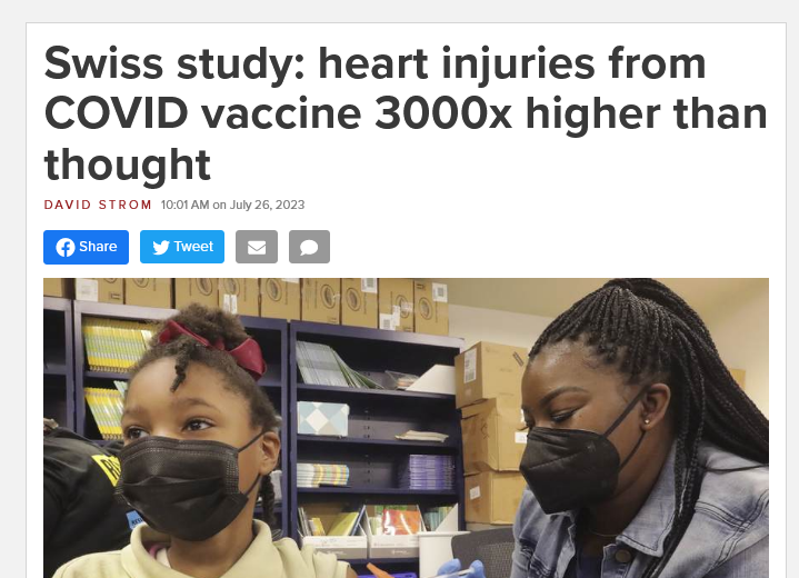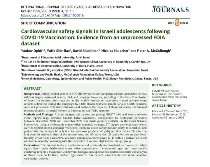 This study analyzes 294,877 unprocessed adverse event reports from Israels Clalit Health Services (2020-2024), obtained via FOIA, focusing on cardiovascular risks in underage vaccinees post-COVID-19 vaccination.https://www.reseaprojournals.com/journals/cardiovascular-research/archive/cardiovascular-safety-signals-in-israeli-adolescents-following-covid-19-vaccination-evidence-from-an-unprocessed-foia-datasetUsing conservative methods, it identifies 277 unique events of acute heart damage.Disturbingly, 271 cases (98%) clustered in 12-16-year-olds during a six-week rollout window.Israels adverse event reporting (Clalits system) can suffer from underreporting. Clalit uses comprehensive electronic health records with active capture of coded diagnoses, unlike passive systems like VAERS so underreporting is not x10, but circa x3-x5. So these 300k of AEs was most probably up to 1.5mln. Thats the probable number of people in Israel that experienced adverse events shortly after "vaccination". Health damage in 300k cases was significant enough that they visited clinics/hospitals and doctors felt obliged to report it as adverse events.Anyways, probability of 271 kids (12-16 yo) suffering from a heart damage in period of 6 weeks is very low, so signal is obvious. Given Israels 880k population of 12-16-year-olds (Clalit covers 440,000), with a conservative background rate of 16/100,000/year for myocarditis/pericarditis, expected cases in 6 weeks: 440,000 x (16/100,000) x (6/52) = 8. Probability of ≥271 (Poisson, λ=8): 0 (computationally <10^{-500}).Events with probability <10^{-500} are vastly beyond everyday experience. It is like winning the lottery jackpot every single day for years or every atom in your body spontaneously quantum-tunneling 1 meter away simultaneously xD