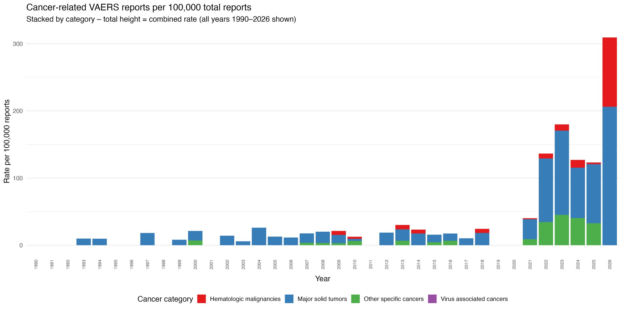 Across all major cancer-tracking indices - diagnosis rates, treatment expenditures, public and institutional attention, and mortality - a clear and consistent signal is observable.All four inflected in temporal concurrence following the introduction of mRNA vaccination.In systems terms, this cancer signal is coherent and persistent, with increased Shannon entropy in the cancer-type distribution—indicating a shift away from dominance by historically primary cancers toward a broader array of secondary and less common types, increasingly observed in younger age brackets compared to just seven years ago.What makes this signal concerning is the combination of factors: the rise in less common cancers, their novel prevalence among traditionally less-susceptible cohorts, and the signal’s overall magnitude (despite a shrink-reduced candidate population)As a system-level phenomenon, it exceeds by a wide margin, the corresponding signals historically associated with tobacco exposure, SV40, or the introduction of agricultural pesticides.https://x.com/EthicalSkeptic/status/2027102087147032676