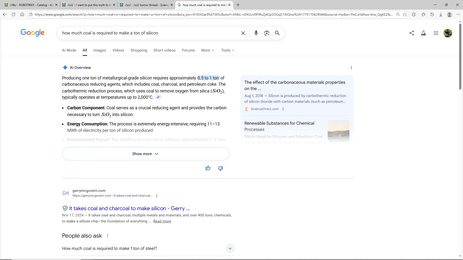 >producing 1 ton of metallurgical grade silicon