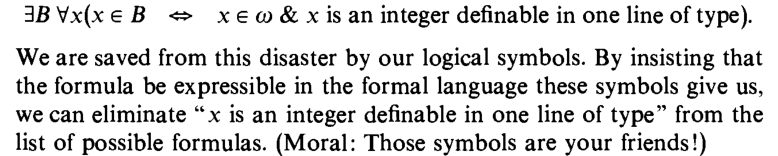 >>16922159since set theory axioms clearly forbid certain sets from existing, the "set of anything that can be expressed in arbitrary terms" would include forbidden sets and therefore be equivalent to a domain error...