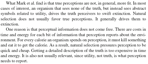 >>16922250Any perception is true by this naive definition, especially if you're a physicalist. Find out how the structure of human phenomenology maps to the dynamics of the cybernetic loop that drives a human and you will have found what "objective" reality perception corresponds to. Perceptions aren't lying to you about what the world is, but your thoughts might. Whoever wrote that drivel barely managed to peel off the first layer of Naive Realism before going straight to making up a new narrative, complete with unfalsifiable evolution-flavored just-so stories, based purely on his intuitions of what's evolutionarily plausible.