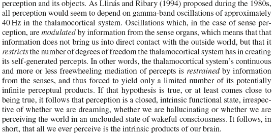 >>16920854https://en.wikipedia.org/wiki/Retinotopyhttps://en.wikipedia.org/wiki/Tonotopyhttps://en.wikipedia.org/wiki/Somatotopic_arrangementhttps://en.wikipedia.org/wiki/Grid_cellThe brain is a collection of modulators that shape and articulate the neural coding through attractor states and other forms of encoding. This is all interpolated by the thalamus and gives a waking slow wave state. If you took away the neurons and just were left with the fields then one would be left with the mind, which is a exteroceptive hallucination through physical external processes. Nervous tissue is like a signal processor/modulator, while the interaction or field perturbation consist of the mind.When people have epilepsy, they are the epileptic attack and that's what's scary about it.