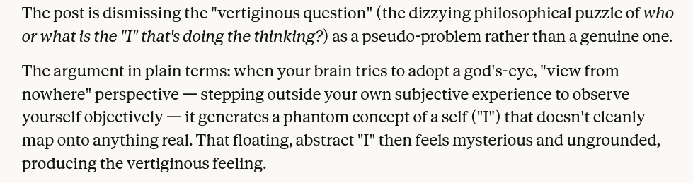 >>16926744I don't even think it's a real "problem". It's just higher cognition detaching from direct experience and trying to LARP as some "objective" perspective beyond the subject's circumstances, which creates a fictional "I" entity that isn't trivially identifiable with the subject (or with anything, for that matter). But what you wrote is still retarded. Why wouldn't the veritiginous question include animal points of view? It just didn't occur to that specific poster. Doesn't make the question any more or less absurd.