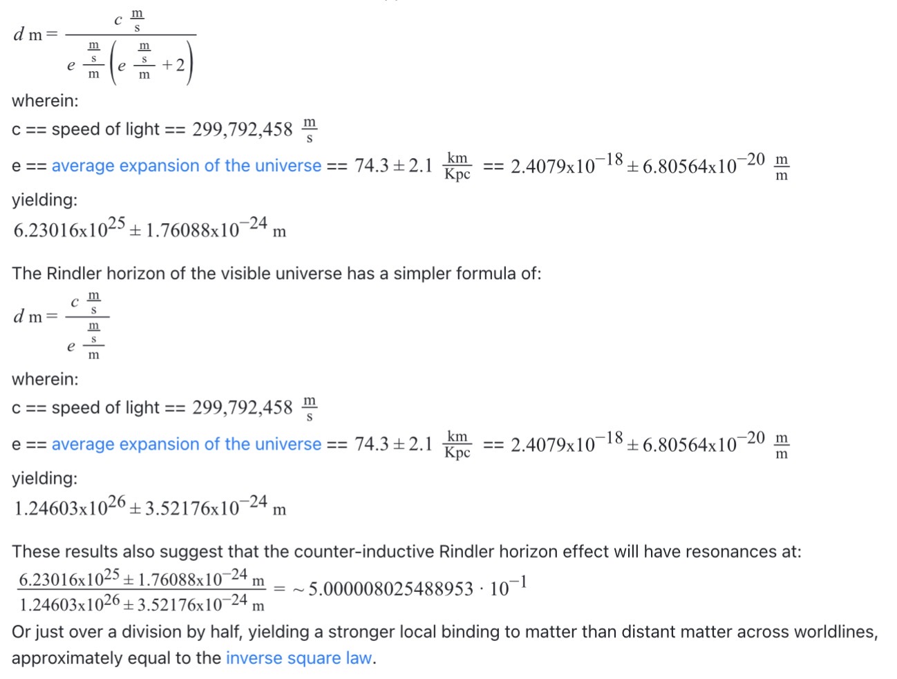 >>16929158Infinite UniverseTaking into account Rindler horizons relating to observation as described above imparting inertia locally, a secondary counter-inductive Rindler horizon occurs wherein a local observer has a horizon at which they can observe a distant observer observing them.This counter-inductive Rindler horizon has an approximate distance of: Pic relatedhttps://www.space.com/17884-universe-expansion-speed-hubble-constant.htmlhttps://www.space.com/17884-universe-expansion-speed-hubble-constant.htmlhttp://hyperphysics.phy-astr.gsu.edu/hbase/Forces/isq.htmlOr just over a division by half, yielding a stronger local binding to matter than distant matter across worldlines, approximately equal to the inverse square law.Further, the alignment with the primary Rindler horizon for a local observer to the particle horizon measured at the edge of the universe is strongly indicative that the edge of the visible universe is not the true edge, and that it is in fact infinite. This raises the question of where the galaxies came from, as an infinite universe suggests no big bang or that the big bang was itself infinite. Which of these is the case does not appear to have enough supporting evidence to say definitively, as we have not yet observed matter being created in a sustainable manner. There is however some experimental evidence to suggest that virtual particles or fluctuations of the quantum foam may produce new matter, in which case the infinite time without start or end model is the likely fit. This theory will not however rely upon either conclusion to fit reality, it is an interesting concept to think about regardless (espeically when considering the additional layers of emergence both above and below us, as the infinite-universe-bound-by-visible-universe-Rindler-horizons perspective would look suspiciously like the quantum foam on a larger scale.)