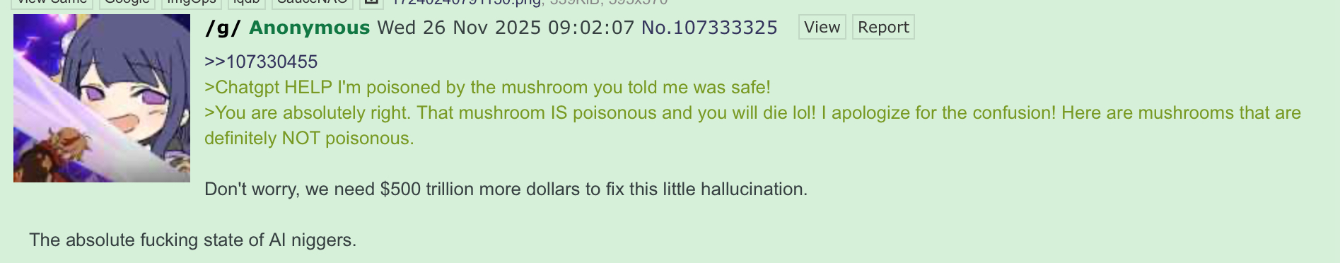 Mushrooms edition>What goes here?- "Vibe science"- Computer science relating to AI- Discussions of how AI will interact with science- Pretty much anything related to AI that is on-topic for /sci/In short, keep the board [math]clean[/math] and throw all of your slop here.