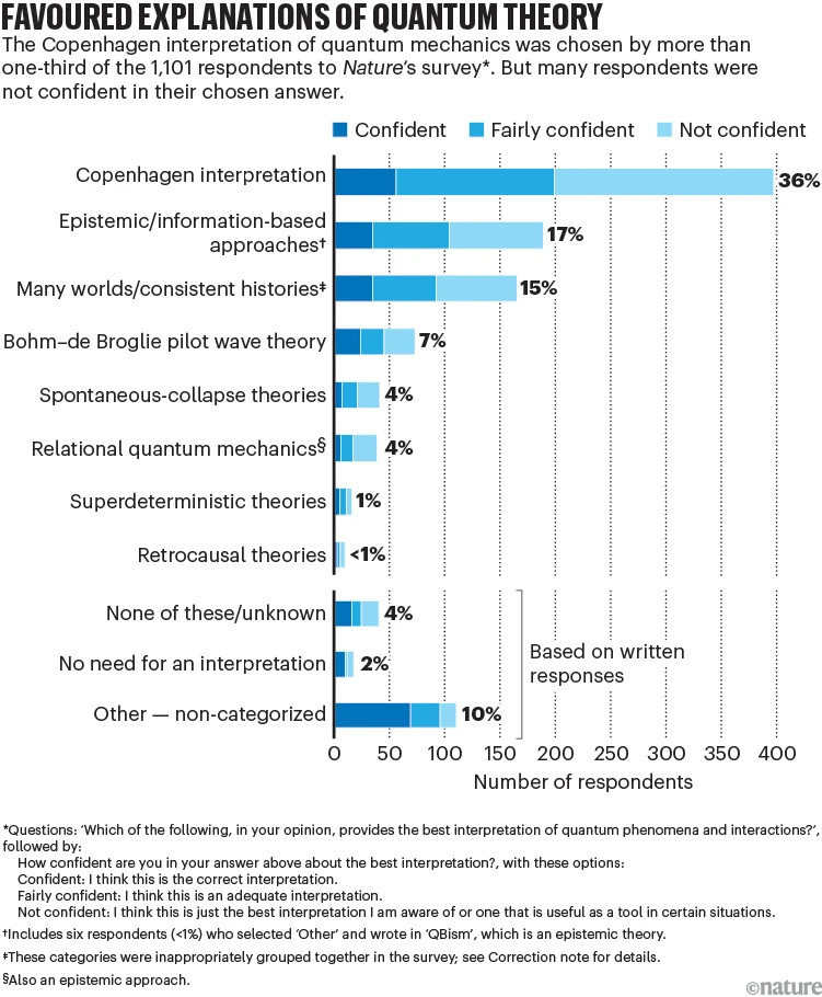 >>16944557>"deterministic" "reality"delusional. None of these experiments disagree with wave function based theories, and most of them model with with greater computational ease than anything bohmtards can cook up.>>16944573>most popular trajectory crankery ("""pilot waves""") barely skirts the 5% markI don't much care about the COPEnhagen interpretation but if you merge it with epistemic approaches it tells you that 57% of people consider QM indeterministic in the bohm schizo sense plus another 15% that basically deem the idea of wave function collapse to be bogus in the first place. This (+2%) yields 74% of people that would agree on the wave function being deterministic and that see no reason to add hidden variable nonsense into the theory just to have trajectories